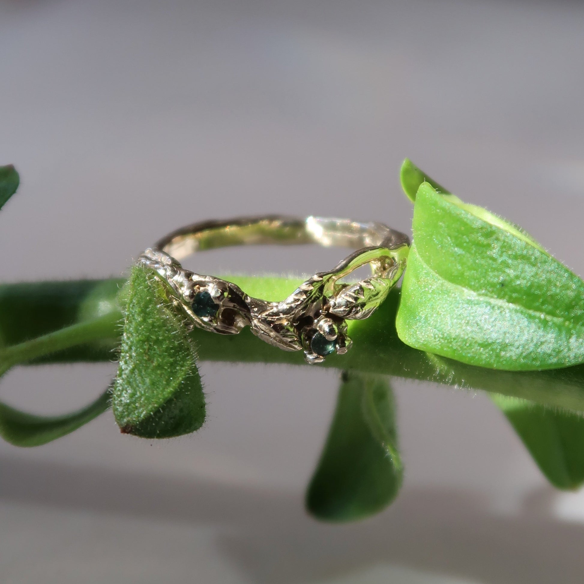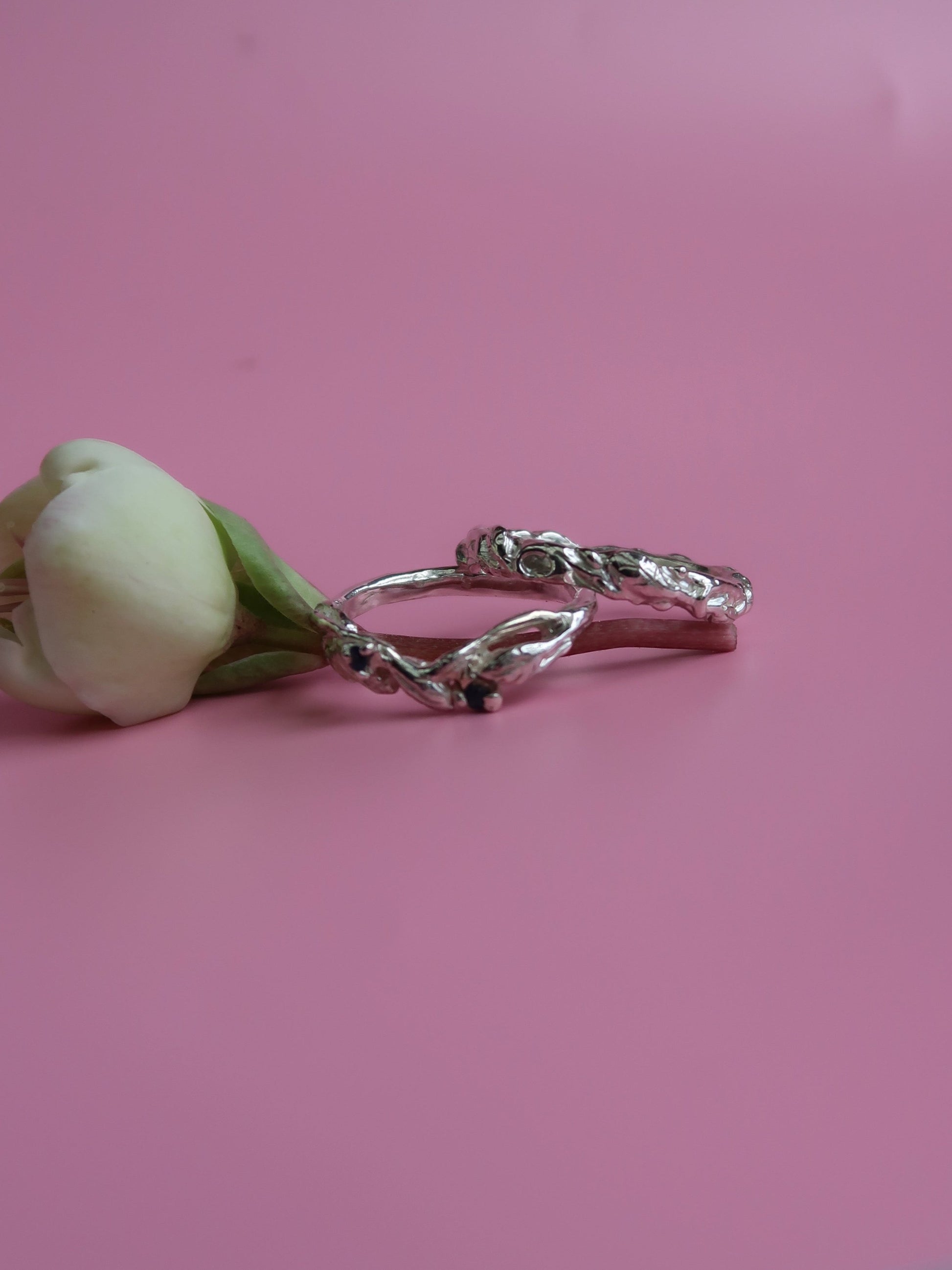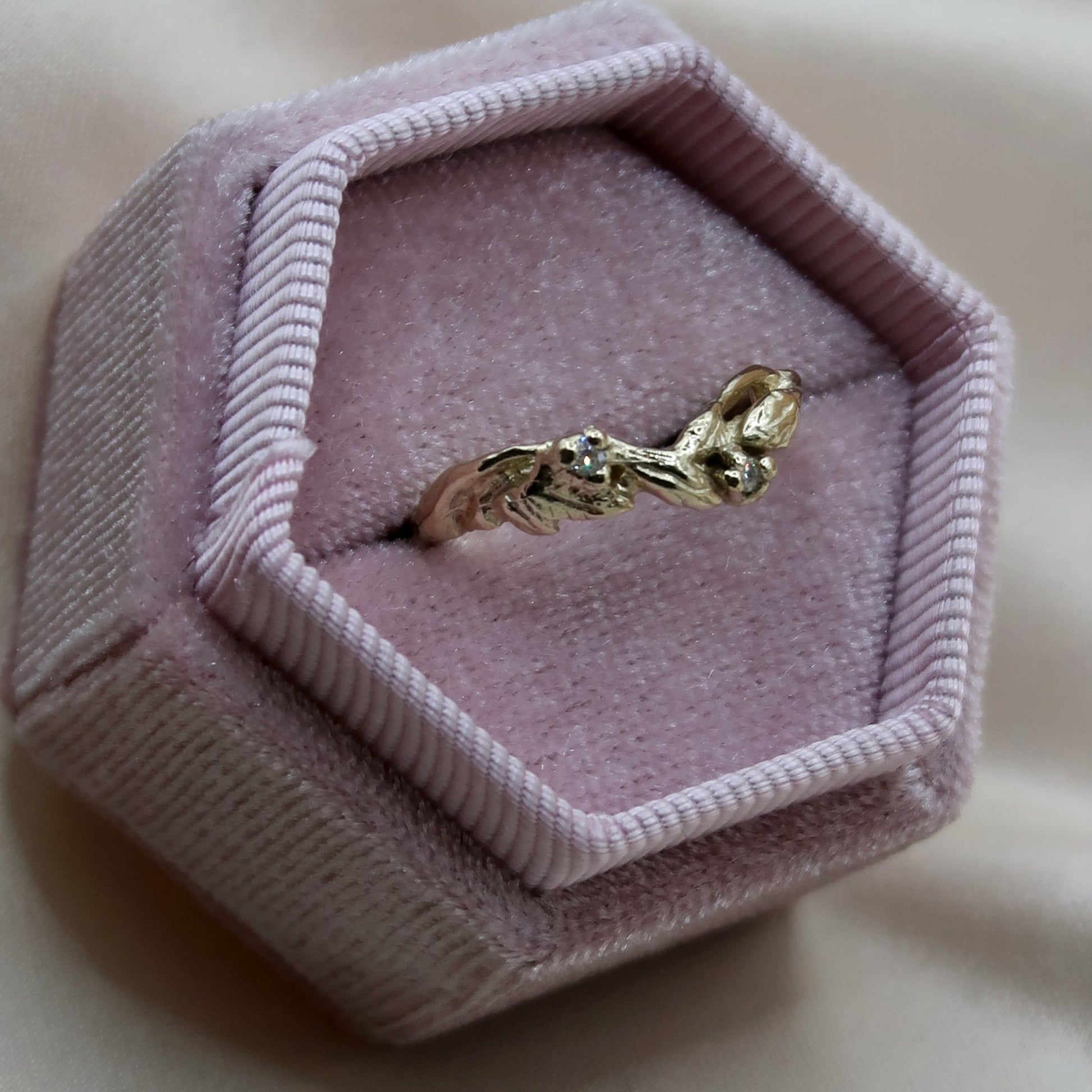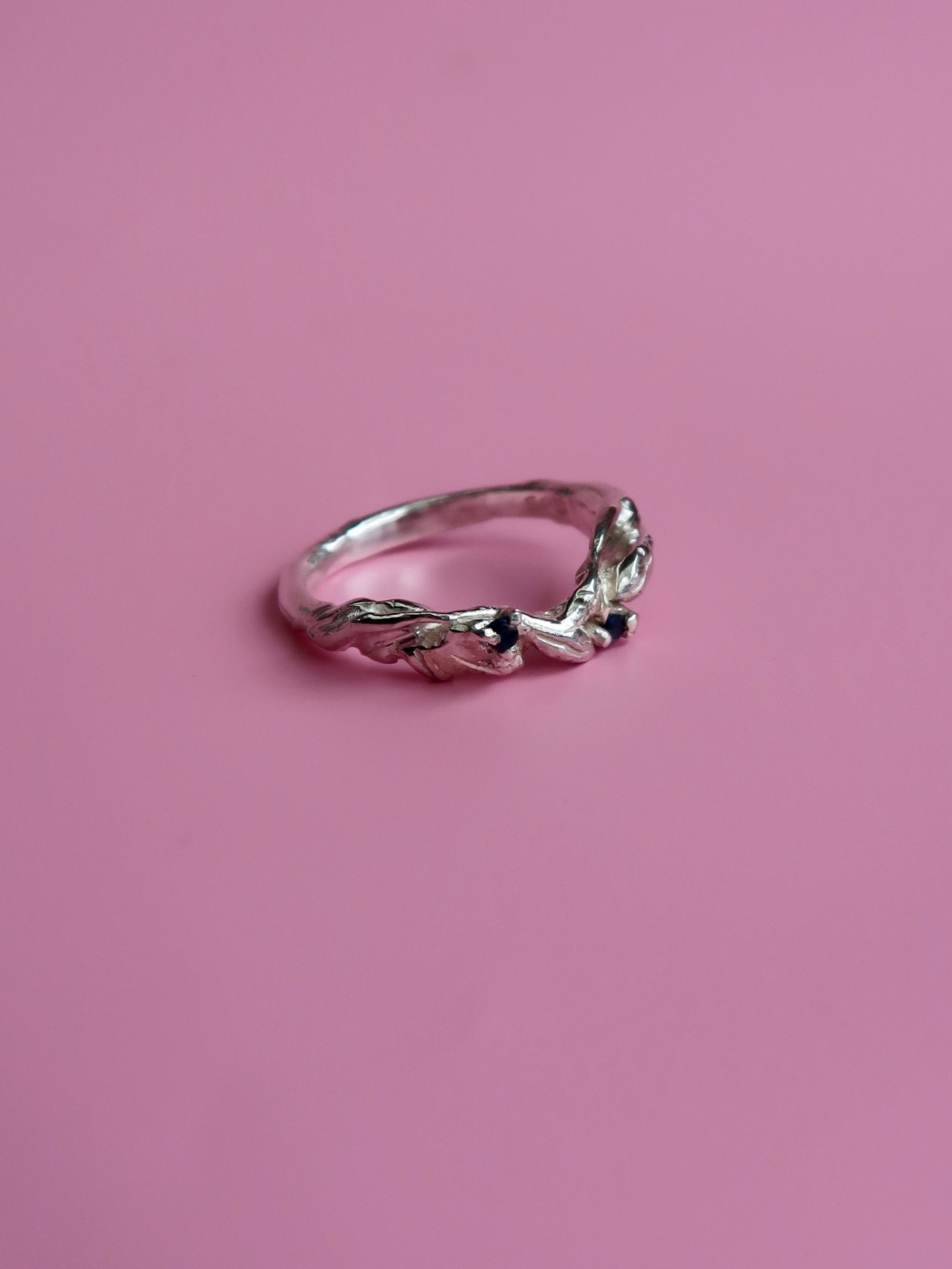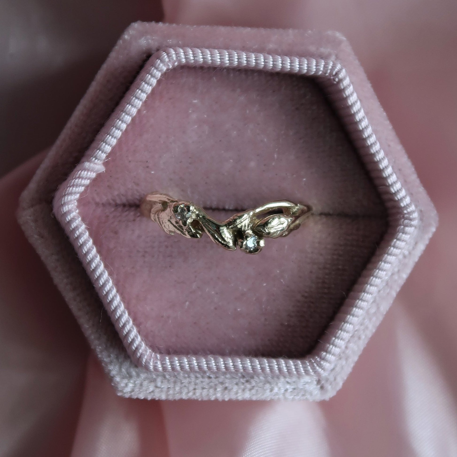 Add a touch of nature to your special day with the Arched Willow Band. This botanical wedding band features delicate leafy details and includes two stunning 1.5-1.7mm gemstones. The slight arch of the design is perfect for pairing with existing rings. Elevate your wedding style with this asymmetrical and elegant piece.