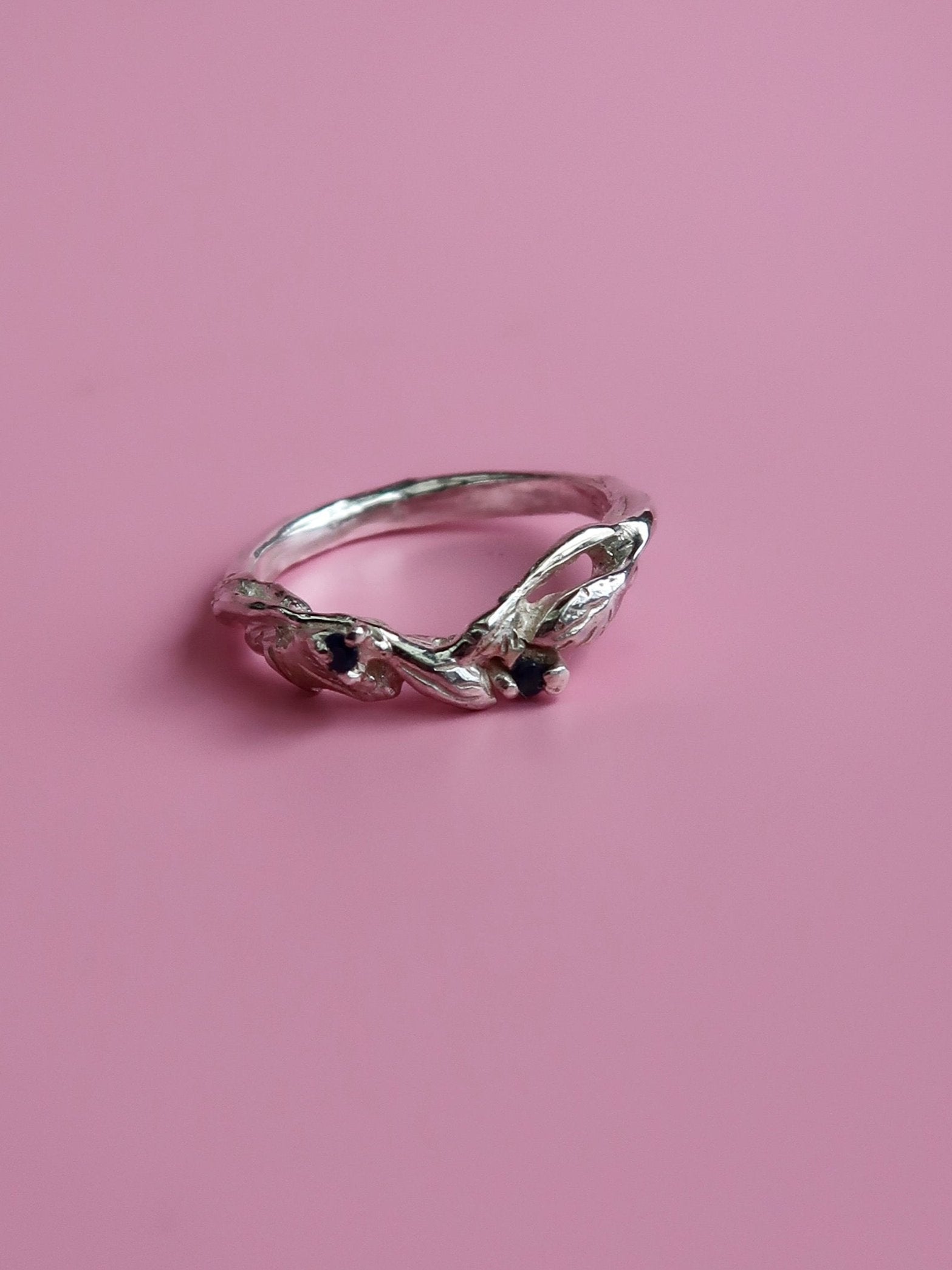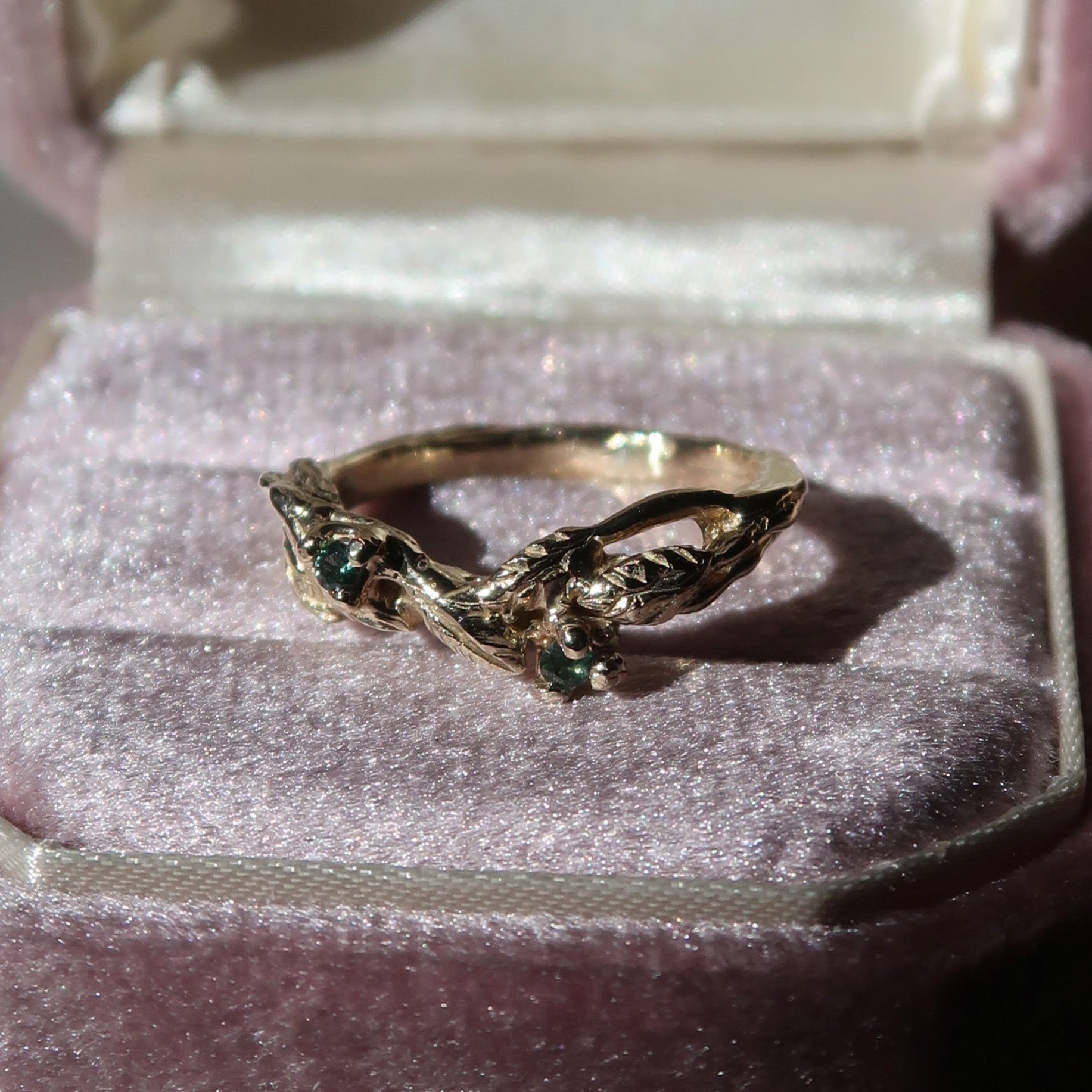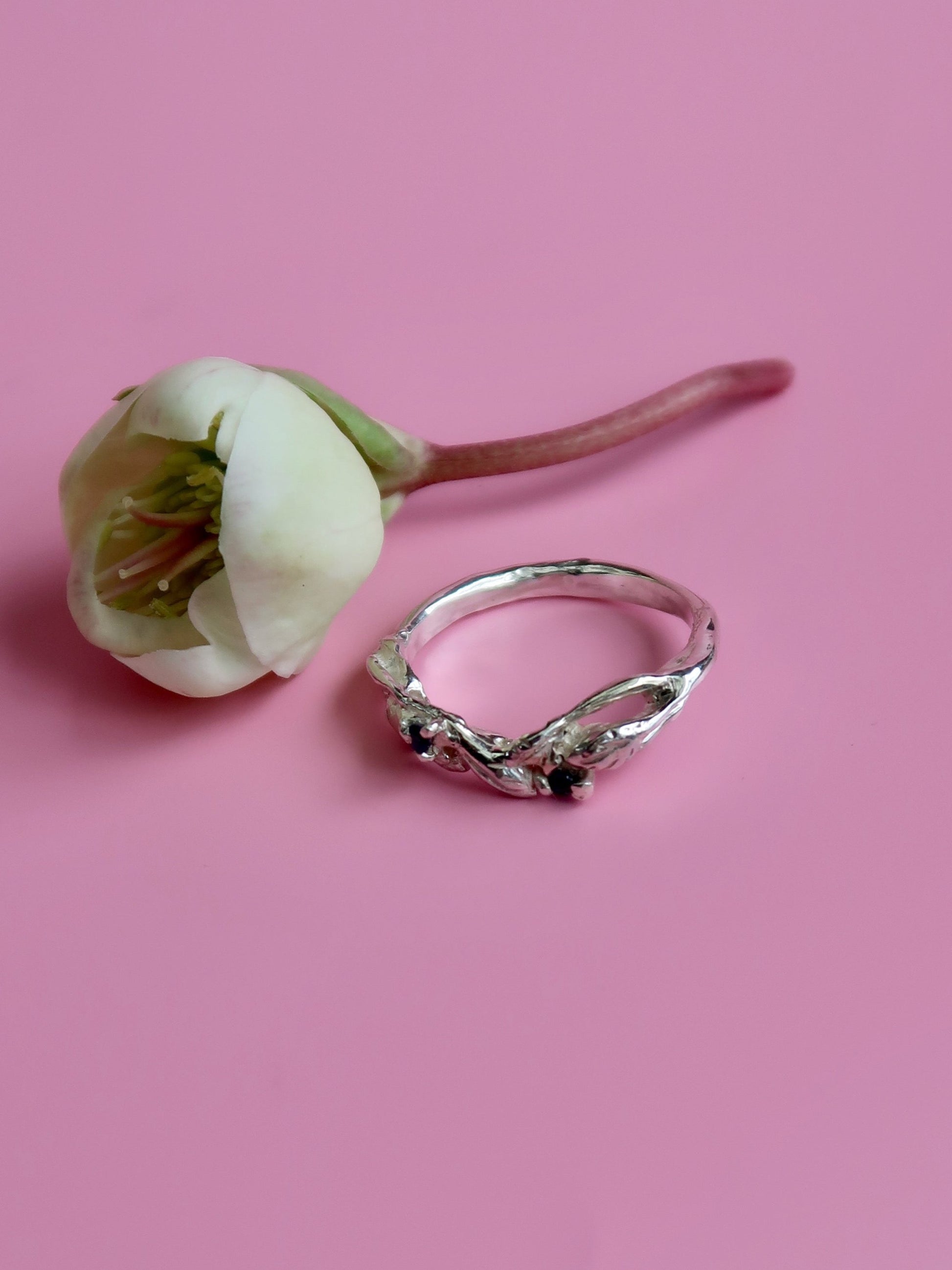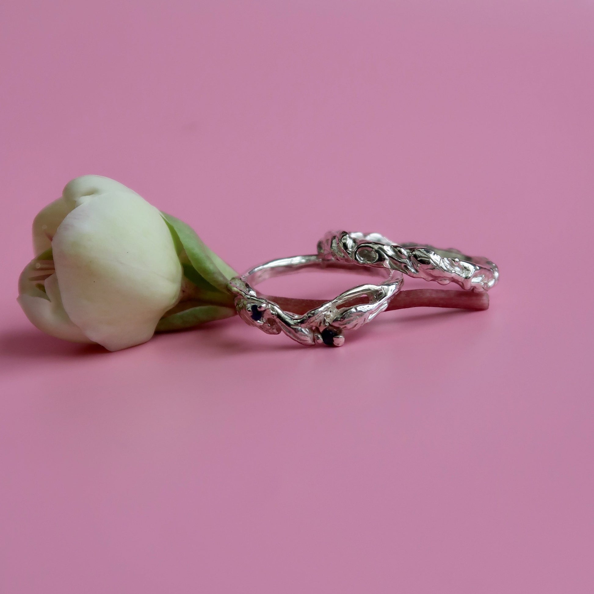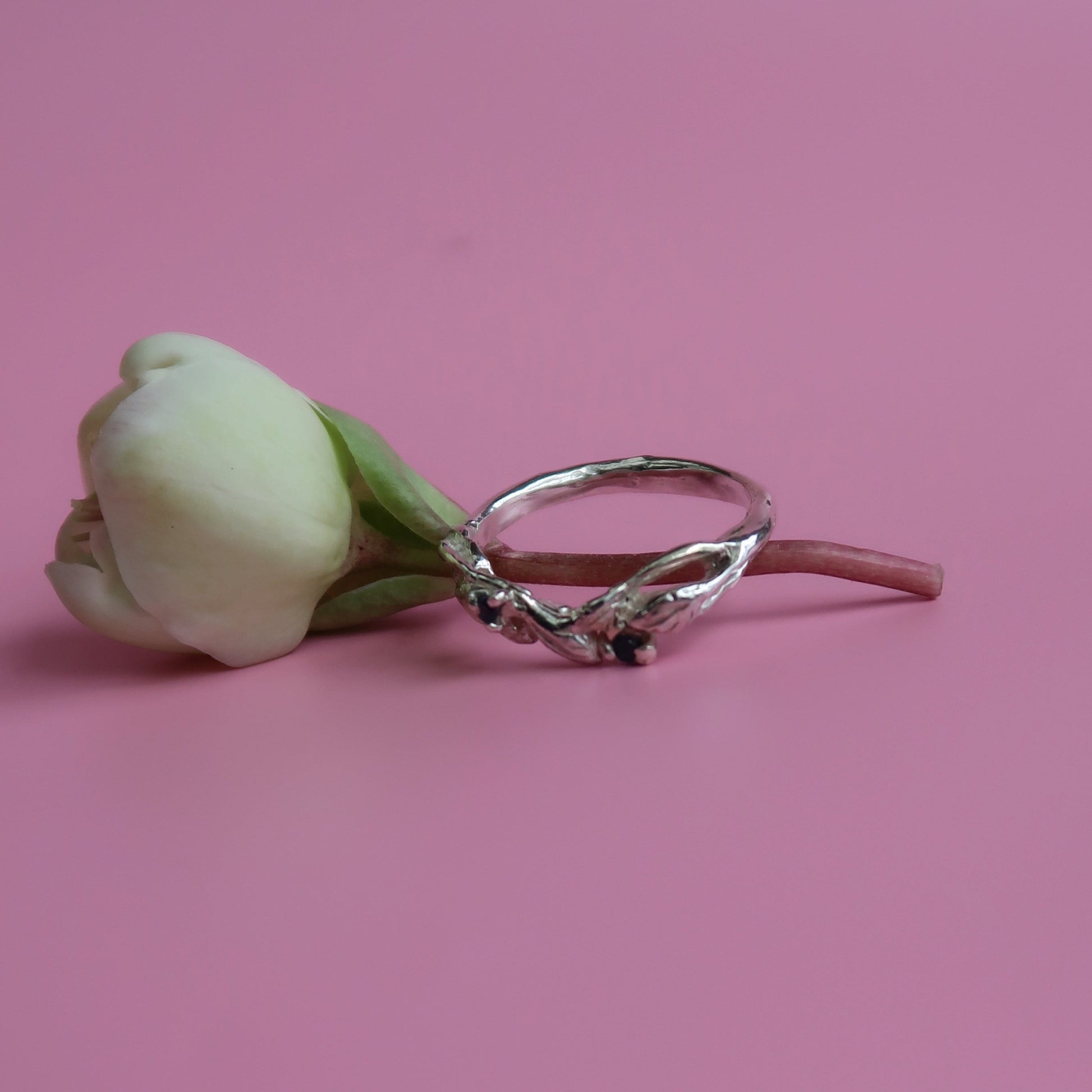 Add a touch of nature to your special day with the Arched Willow Band. This botanical wedding band features delicate leafy details and includes two stunning 1.5-1.7mm gemstones. The slight arch of the design is perfect for pairing with existing rings. Elevate your wedding style with this asymmetrical and elegant piece.