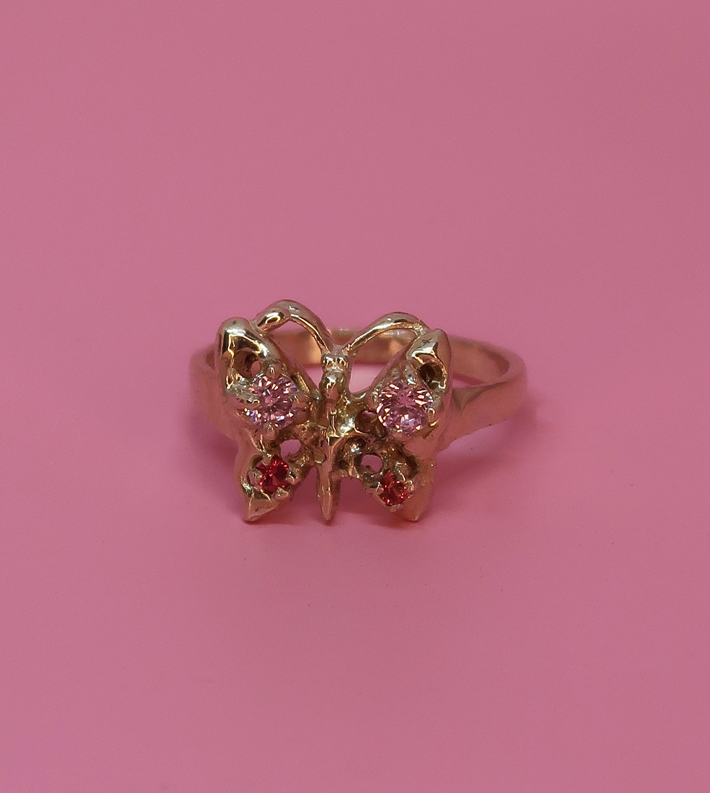 A stunning ring crafted in recycled 9ct yellow gold, modelled after the Butterfly Hoops. This ring features 2x 3mm pink sapphires and 2x 1.8mm Australian pink-red sapphires.