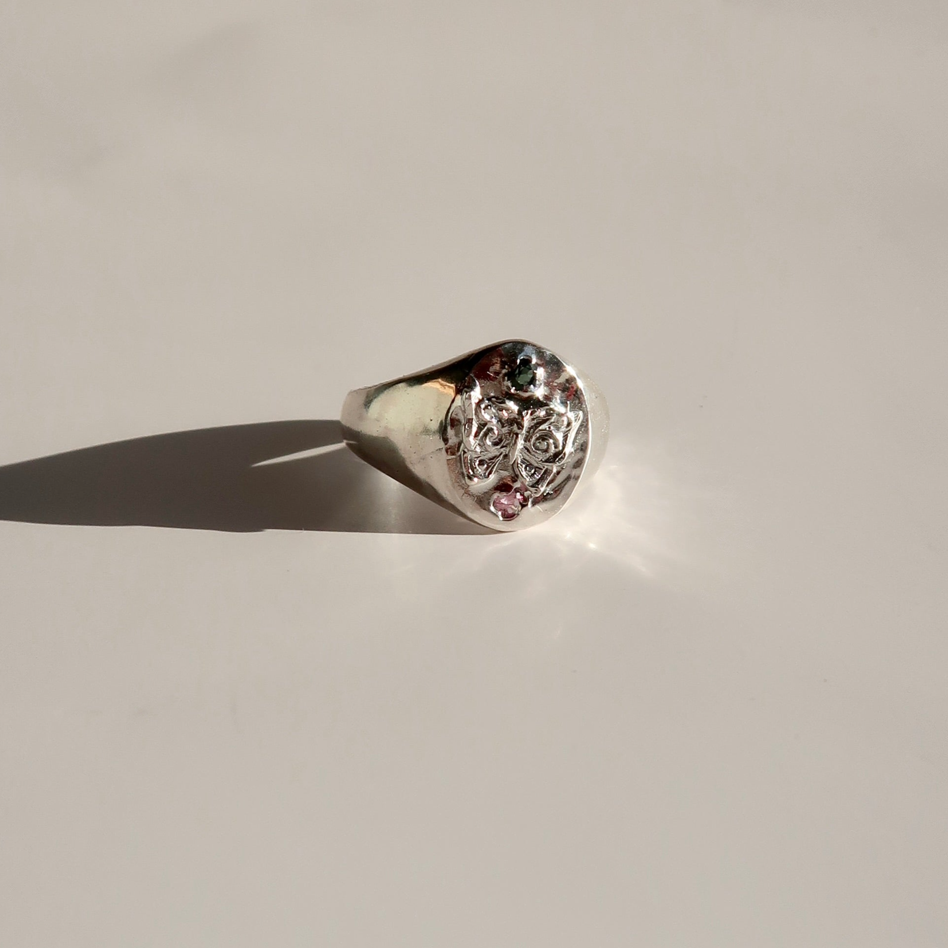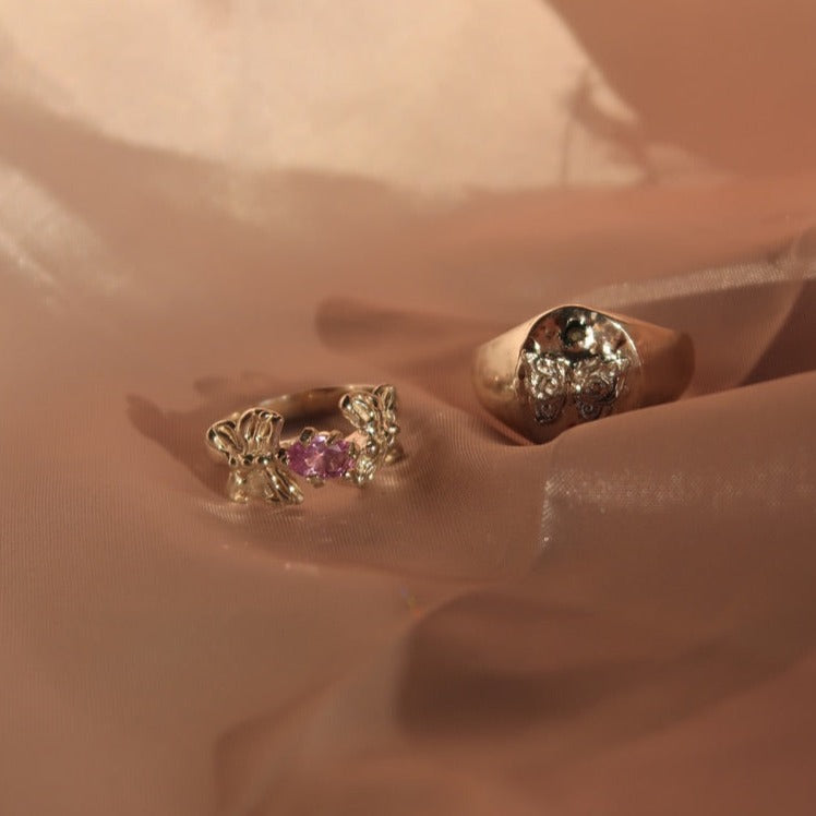 A feminine take on the classic signet. A sweet little butterfly sprawls across this oval signet face with a 2.6mm deep teal Australian sapphire and gorgeous 2.2mm bubblegum pink sapphire.