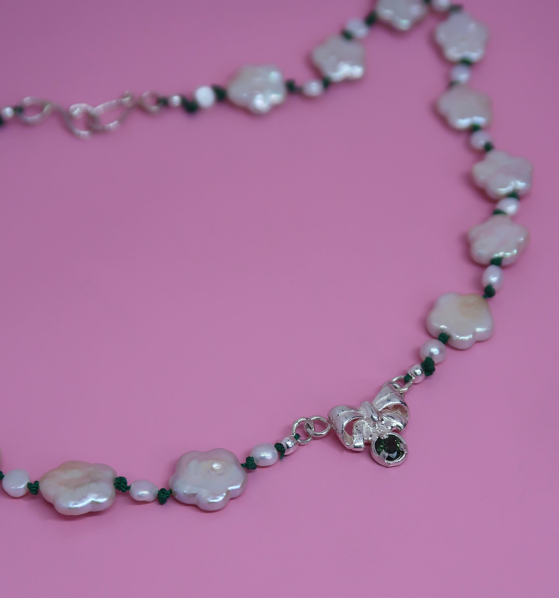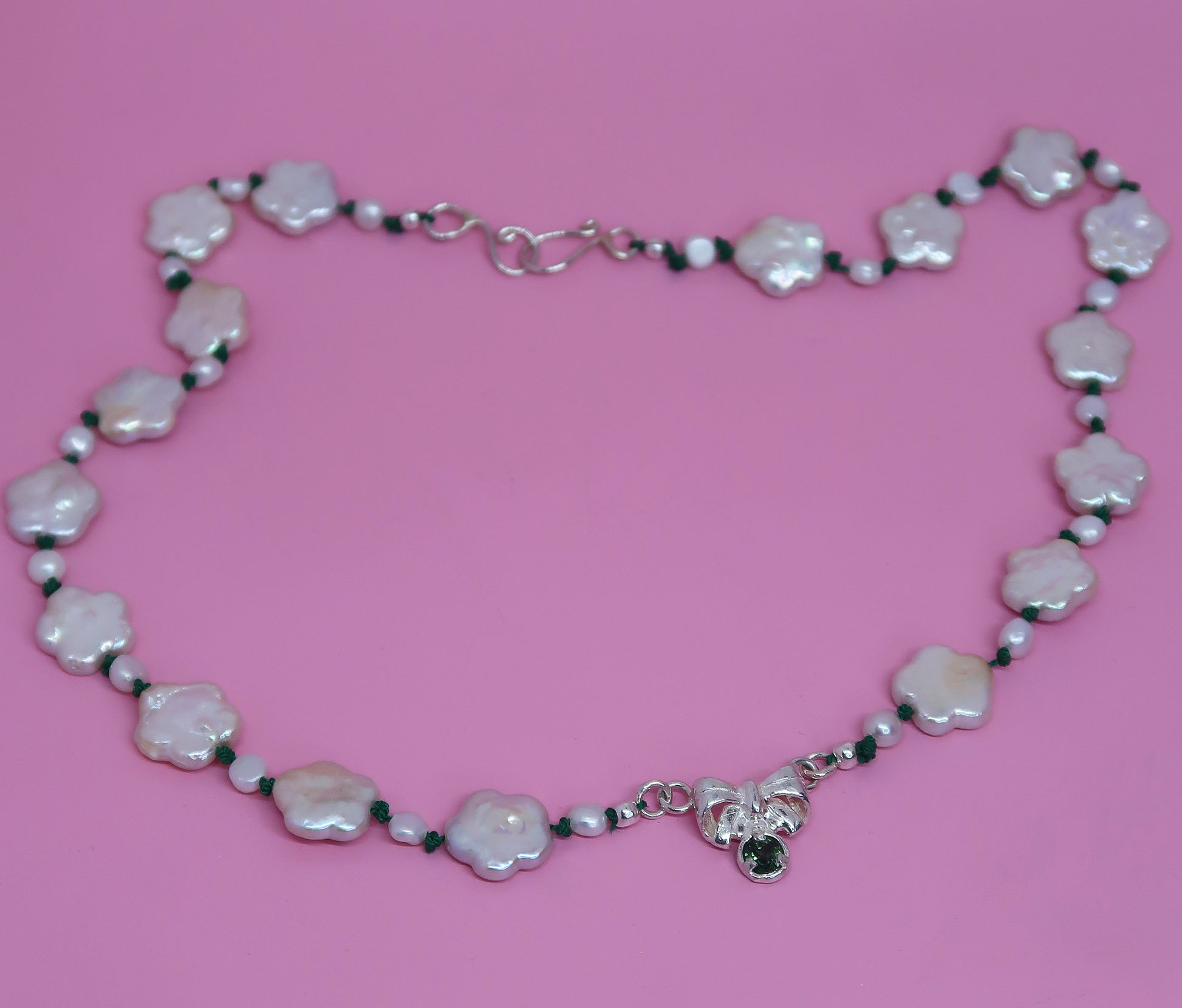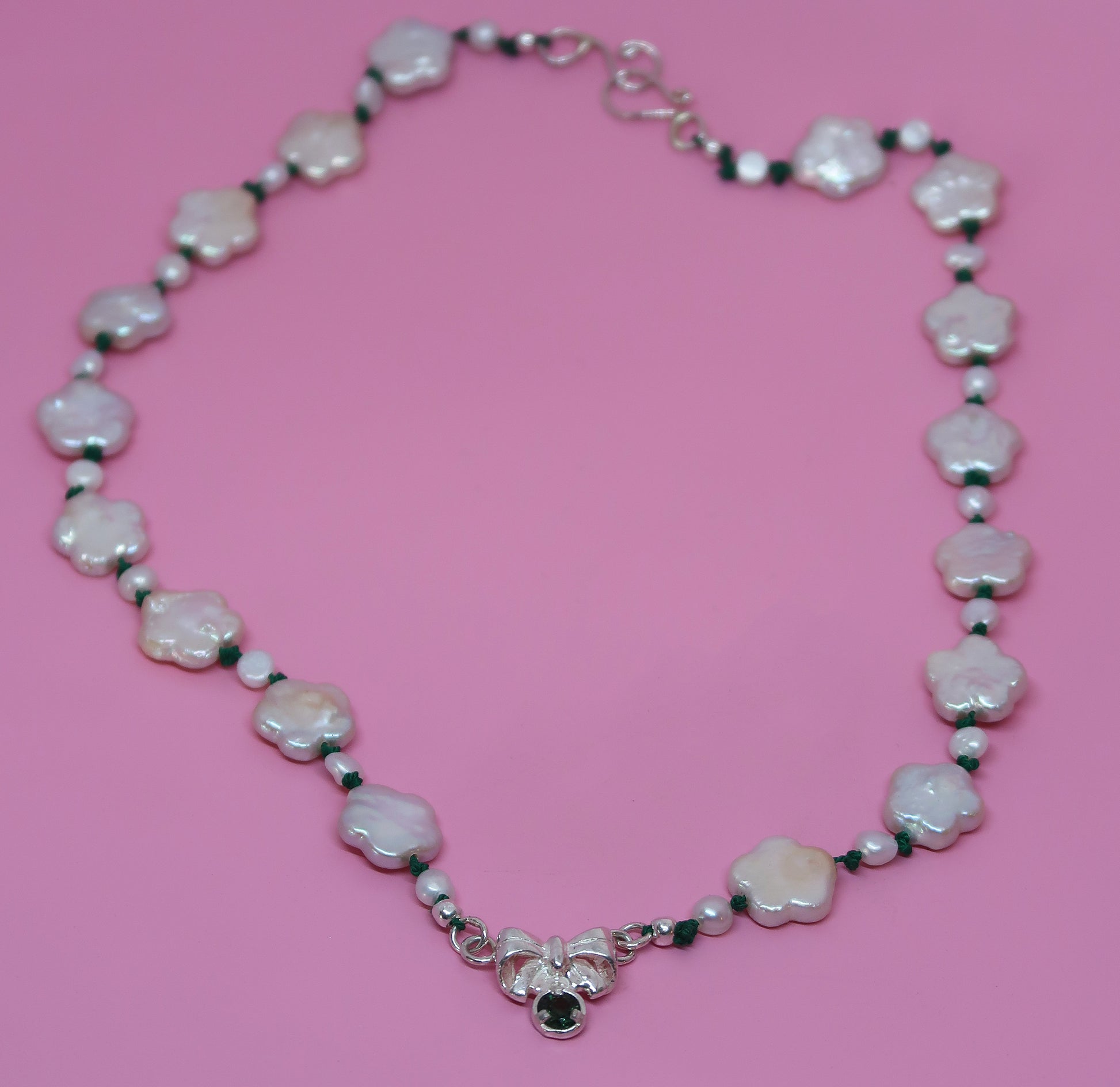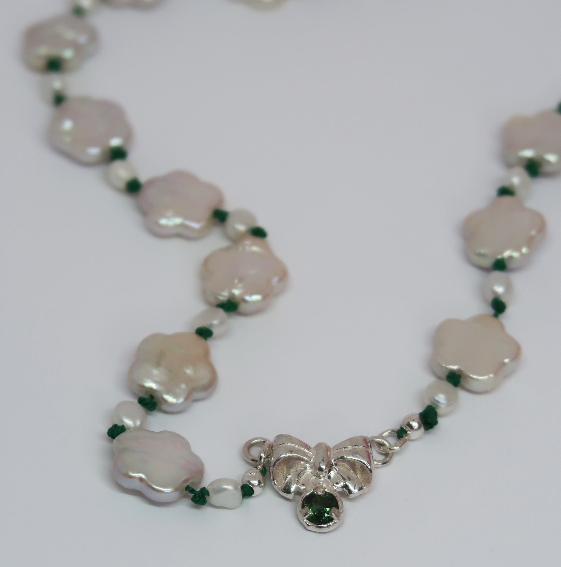 This exquisitely crafted Bespoke Daisy Chain Pearl & Sapphire Necklace features meticulously hand-strung round & floral-shaped freshwater pearls and a 4.1mm Australian forest green sapphire, together forming a bow-shaped motif. Hand-made sterling silver fixtures and emerald green silk thread complete this stunning design.