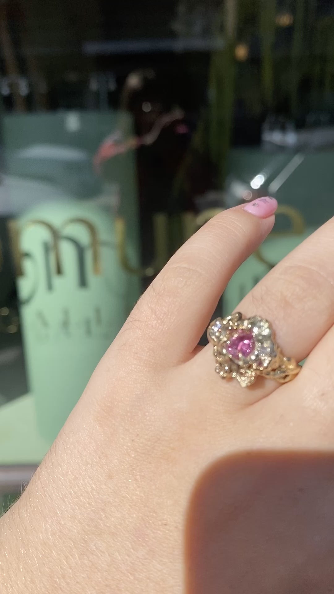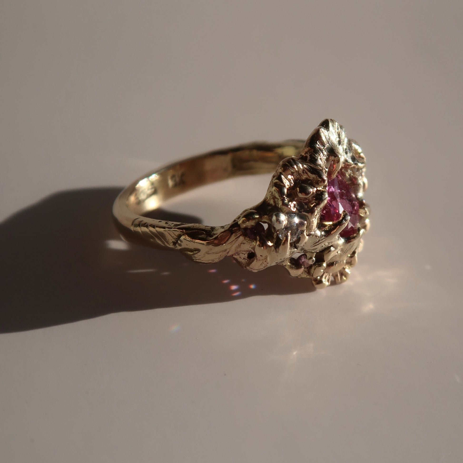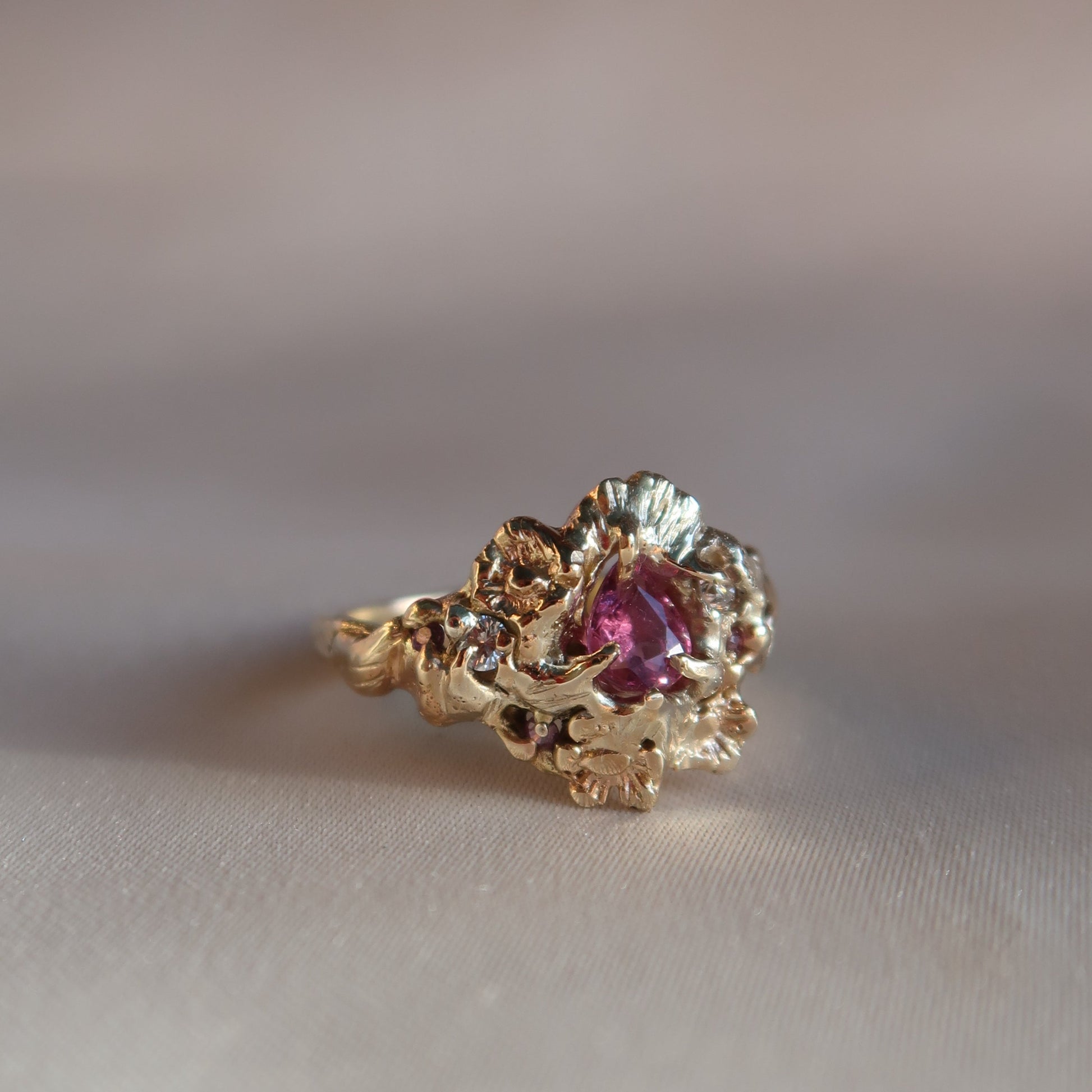 Introducing the Bespoke Flower Meadow Ring, a highly textured ring made in 9ct yellow gold. With an abundance of floral, leafy, and viney textures and a sumptuous 6.2x5.5mm pear cut pink rhodolite garnet at its center, this ring is a true work of art. Treat yourself to this exclusive and enchanting ring.
