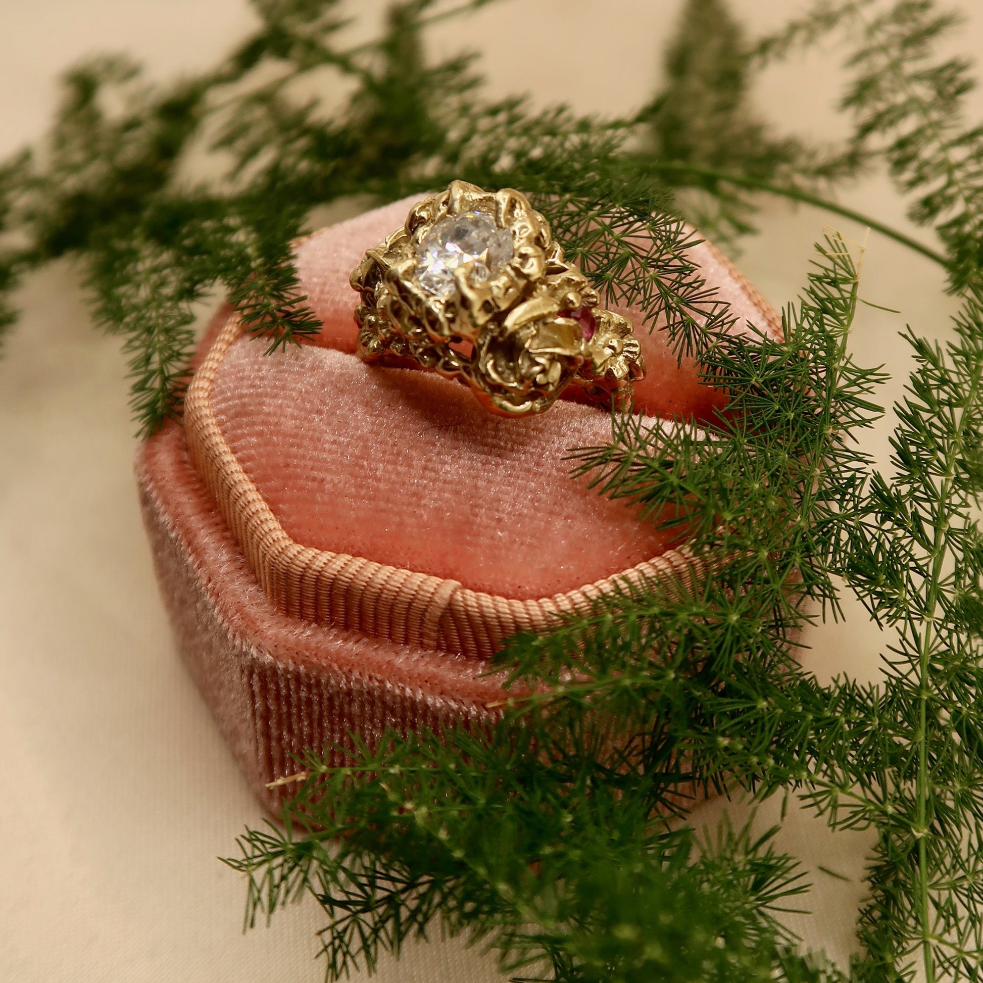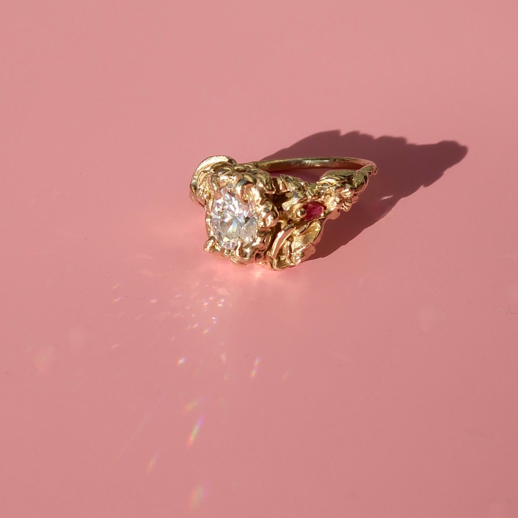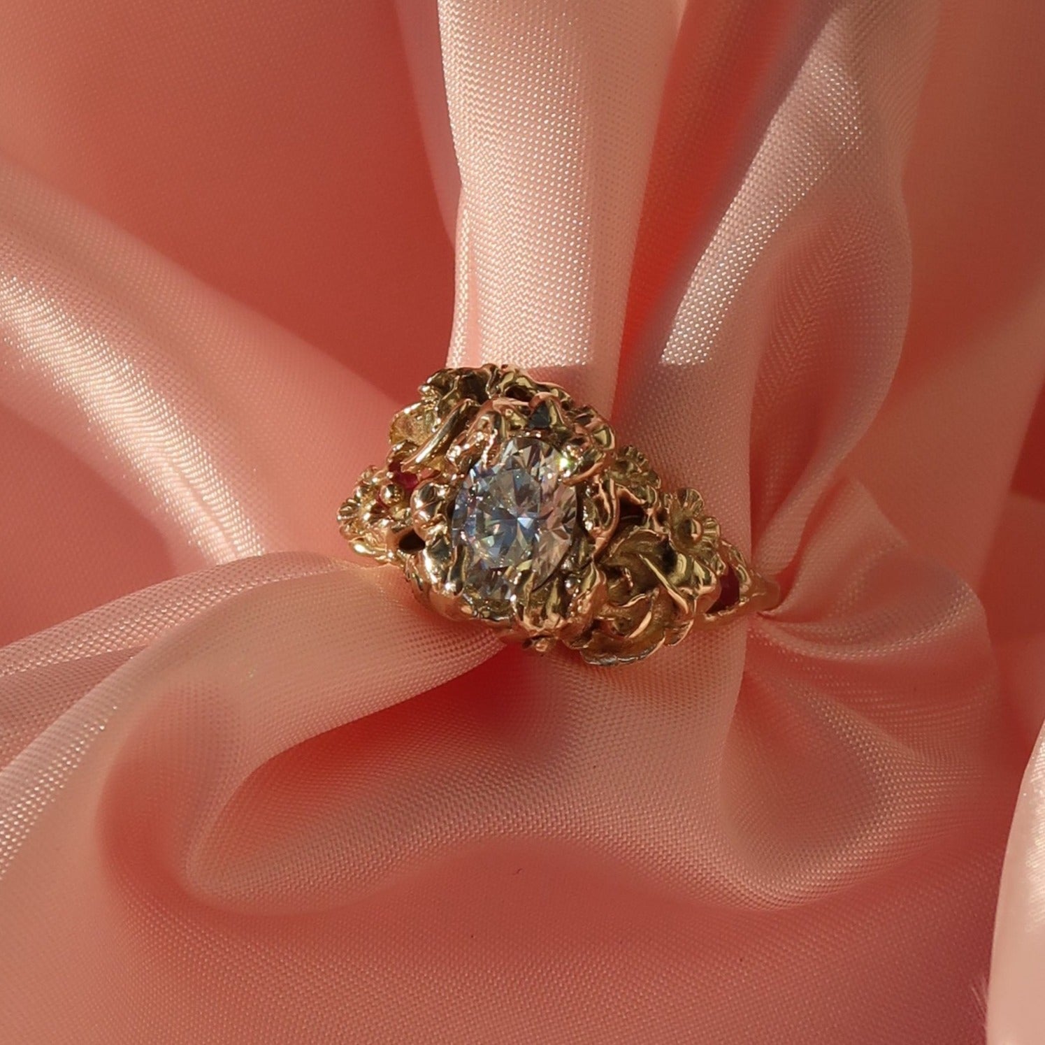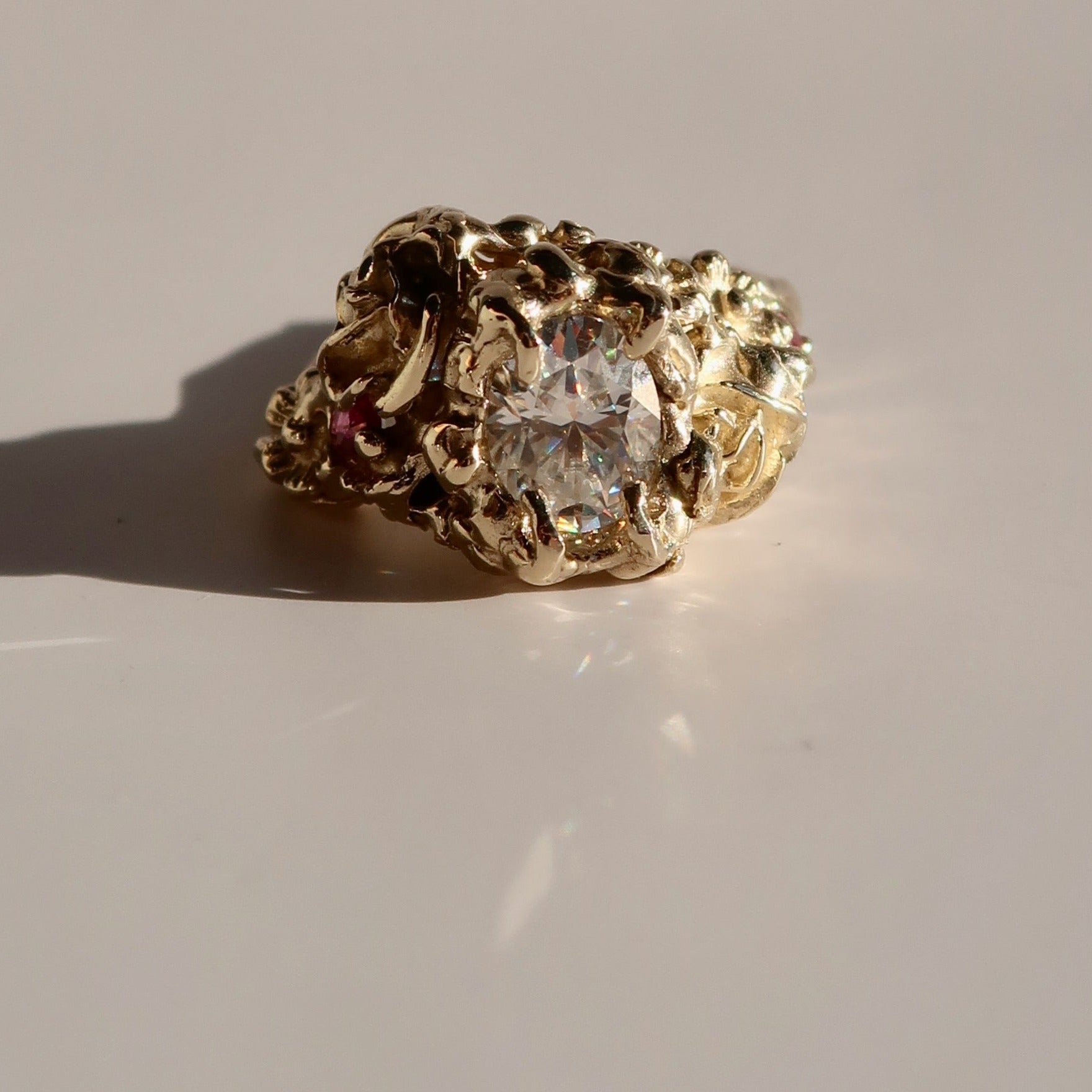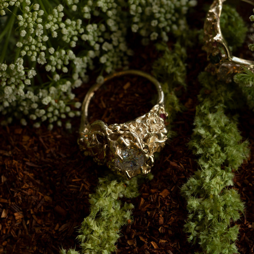 The bespoke Garden Path Ring was specially crafted for NGV's Design Week. A lightweight, incredibly detailed, chunky ring with rose and wildflower detailing. Vine-like claws encase a stunning 1ct oval-cut moissanite. Buried within the floral details are two Australian marquise-cut rubies 4.2x1.9mm.