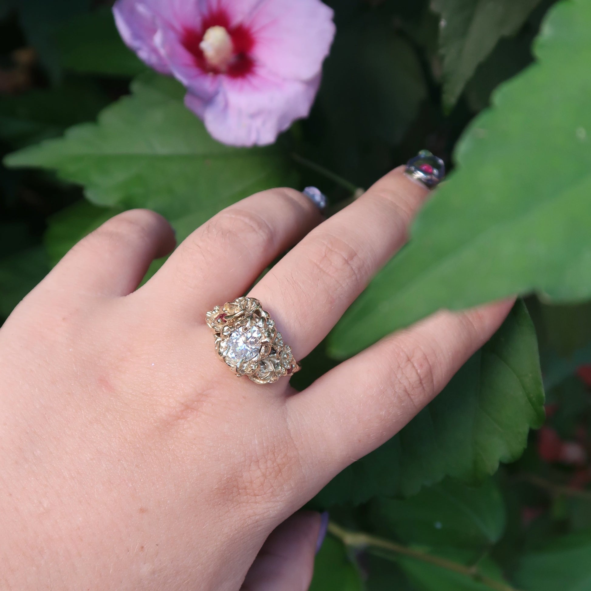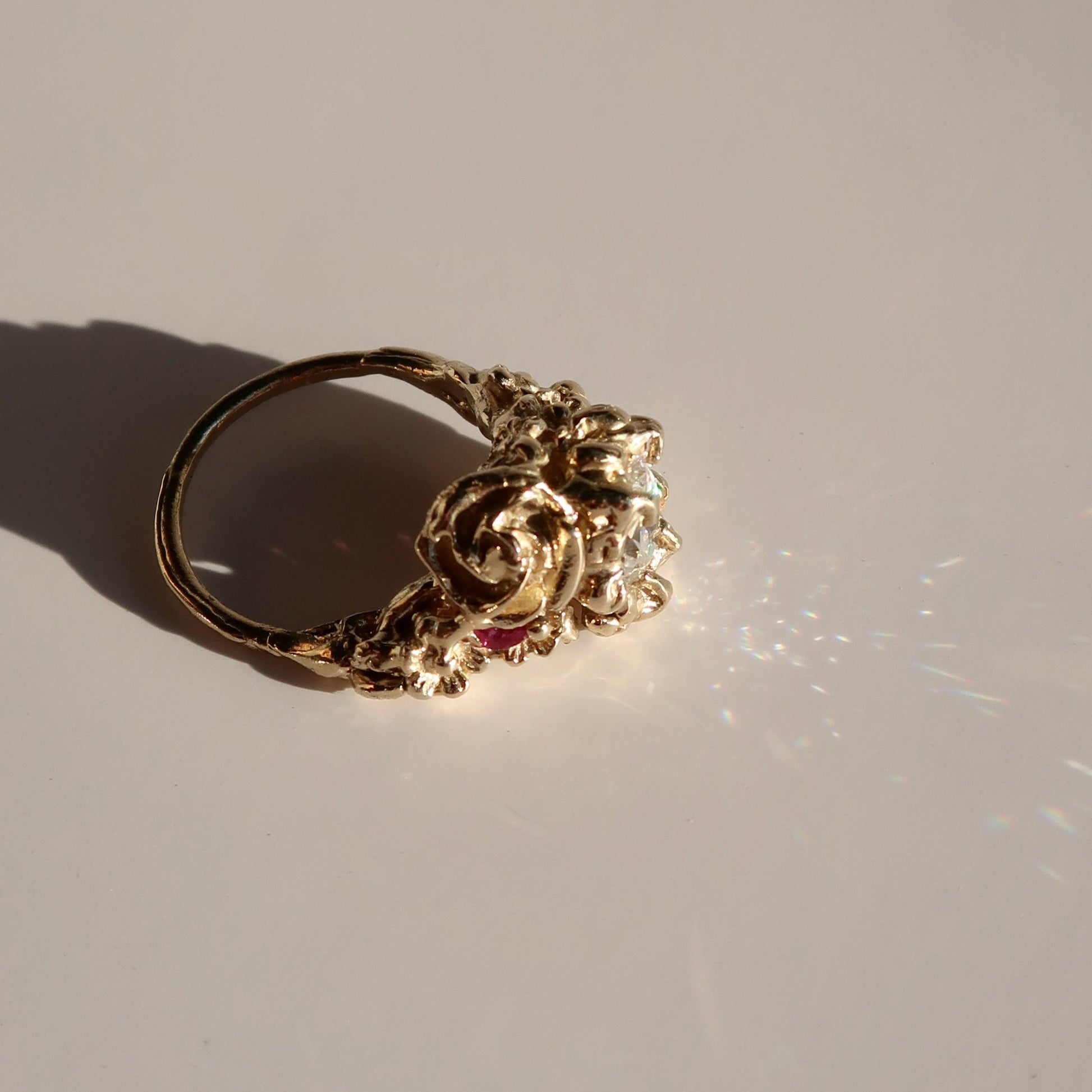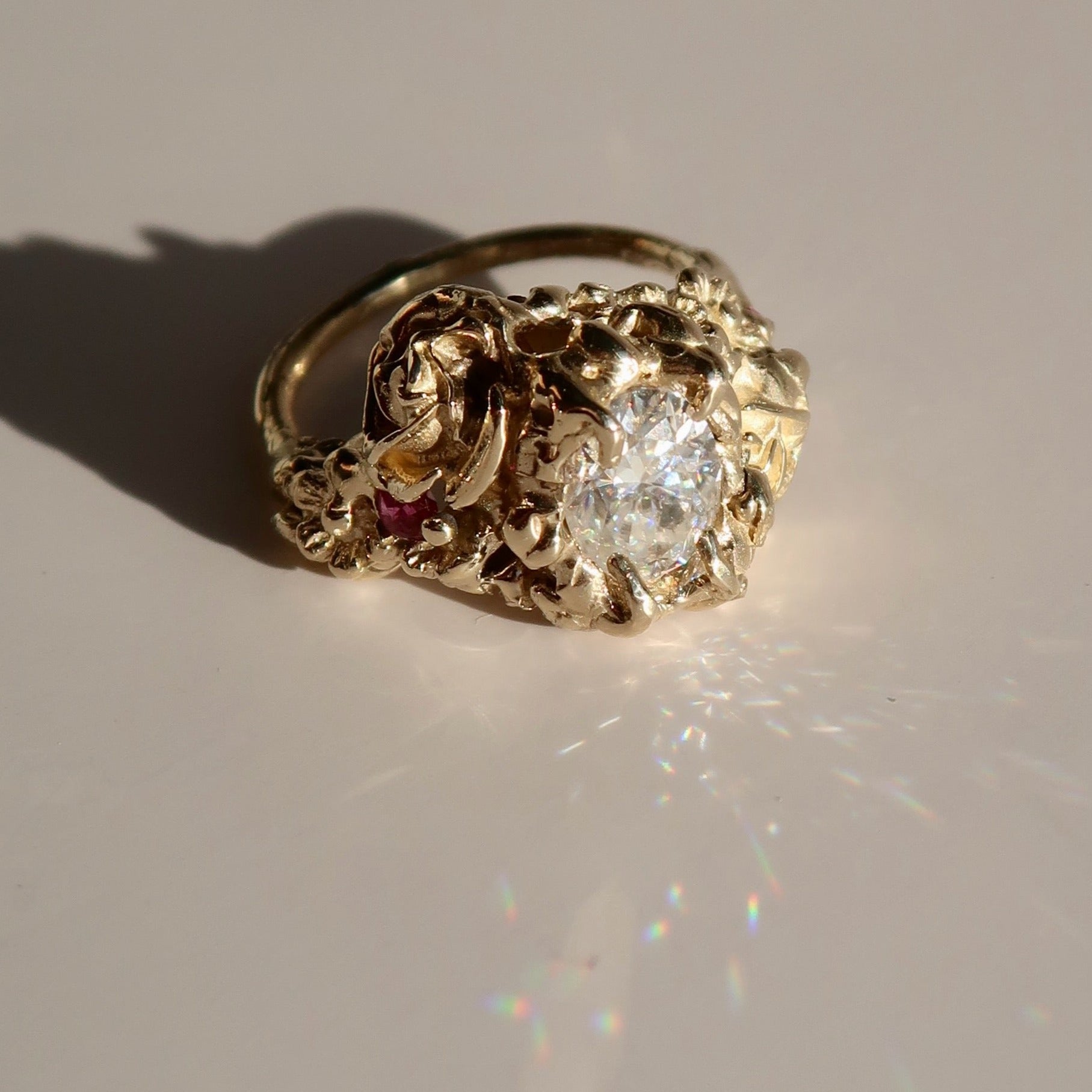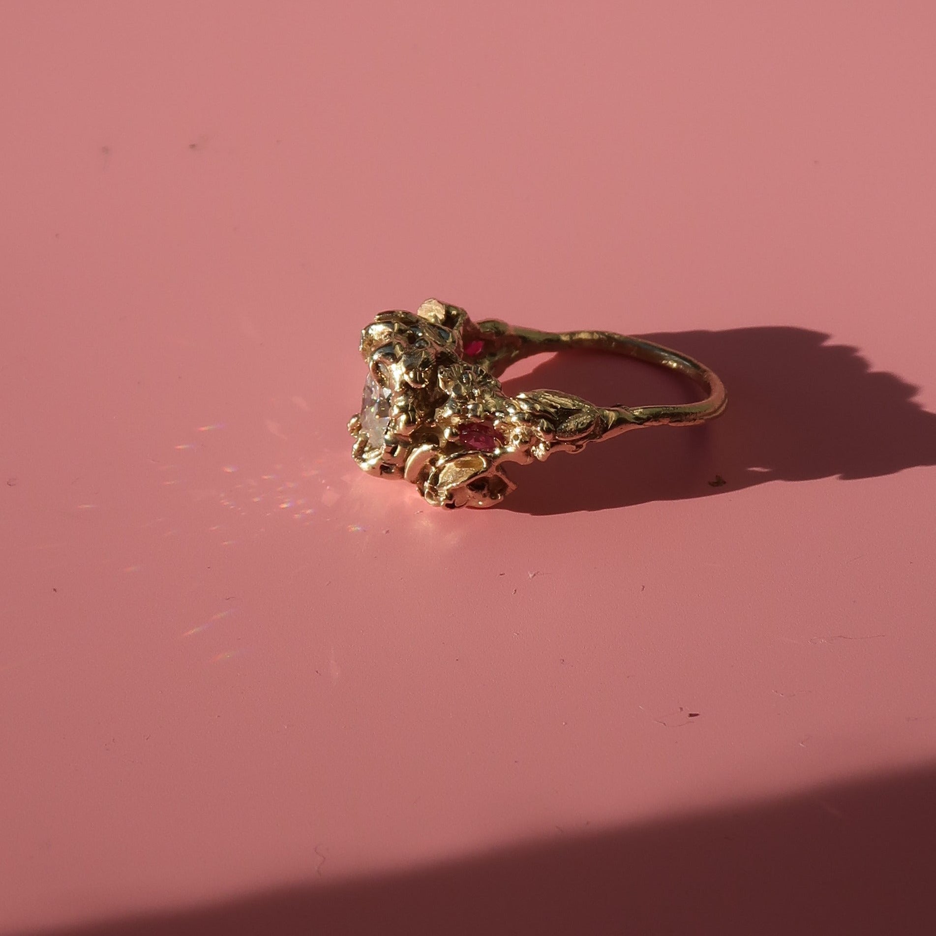 The bespoke Garden Path Ring was specially crafted for NGV's Design Week. A lightweight, incredibly detailed, chunky ring with rose and wildflower detailing. Vine-like claws encase a stunning 1ct oval-cut moissanite. Buried within the floral details are two Australian marquise-cut rubies 4.2x1.9mm.