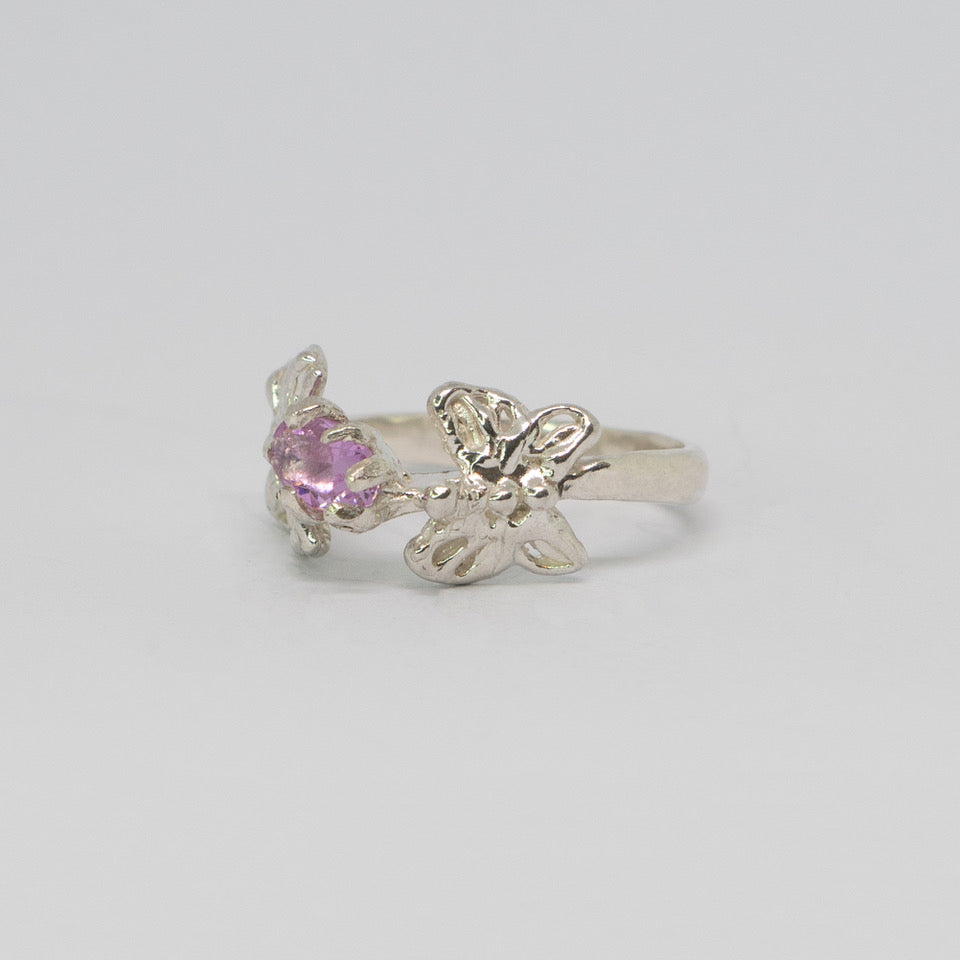 A beautiful one-off ring featuring a 6.2x4.4mm oval-cut lab-grown pink sapphire. On either side of the band is a darling butterfly. This ring is crafted in recycled sterling silver.