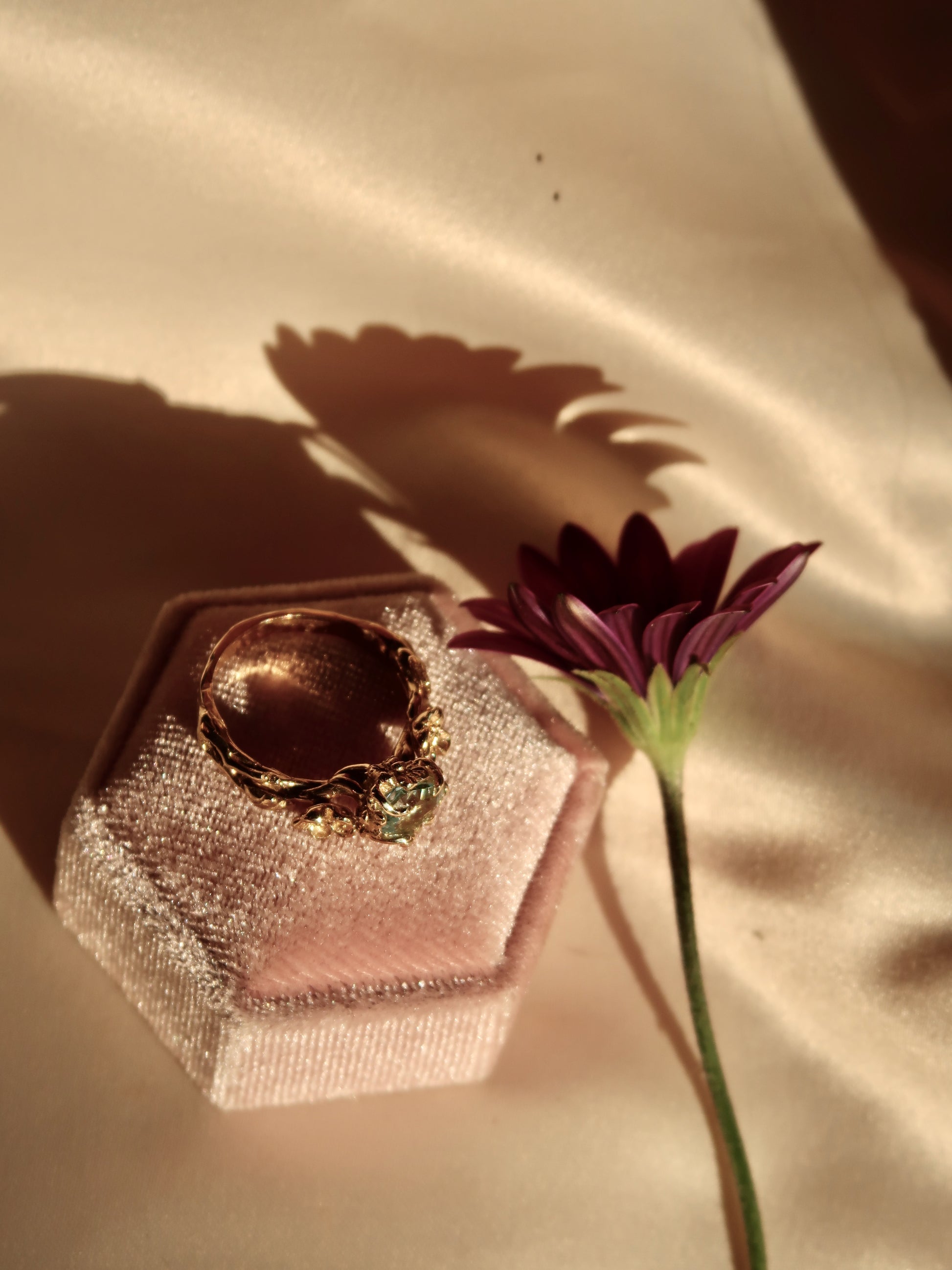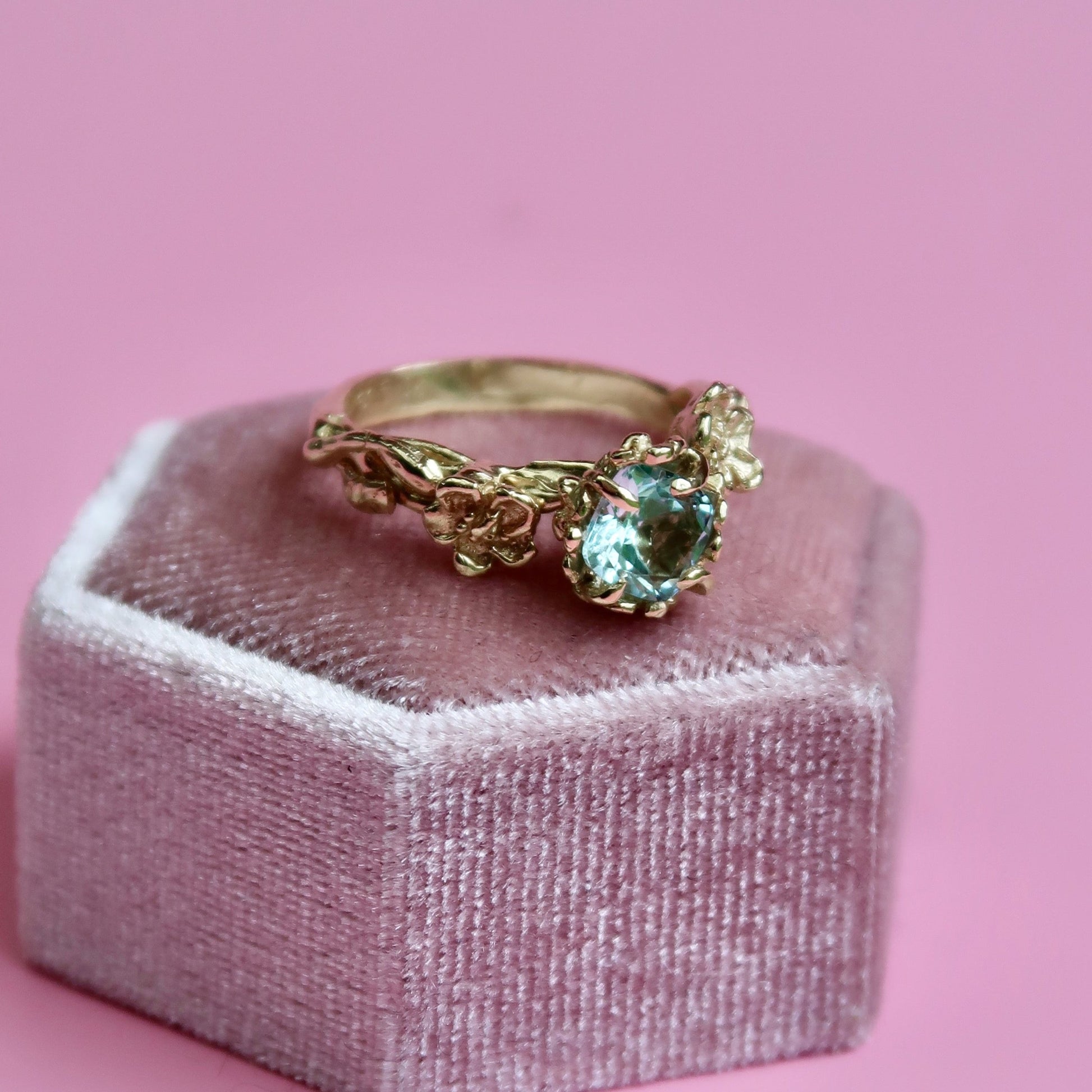 The Bespoke Wildflower Ring is a one of a kind whimsical beauty. This spectacular icy-blue cushion-cut aquamarine is set in 9ct yellow gold, adorned with twisting flowers and vines. A truly unique piece that will make you feel like you're living in a fairytale.