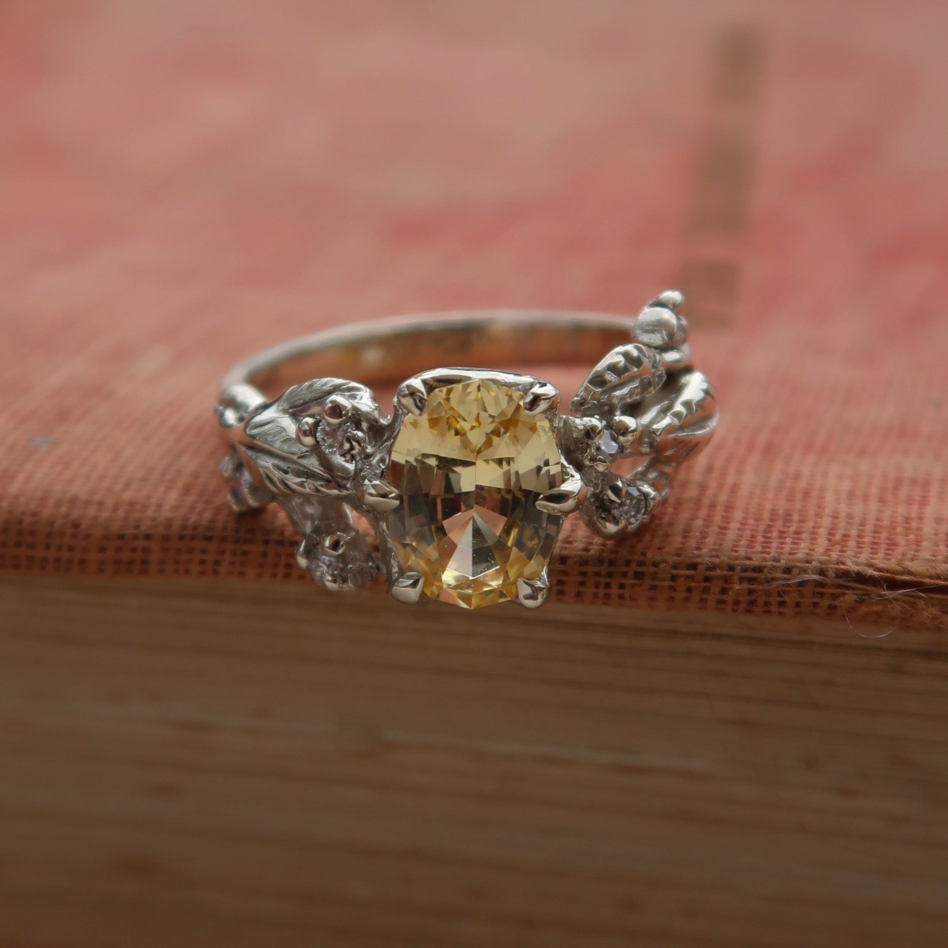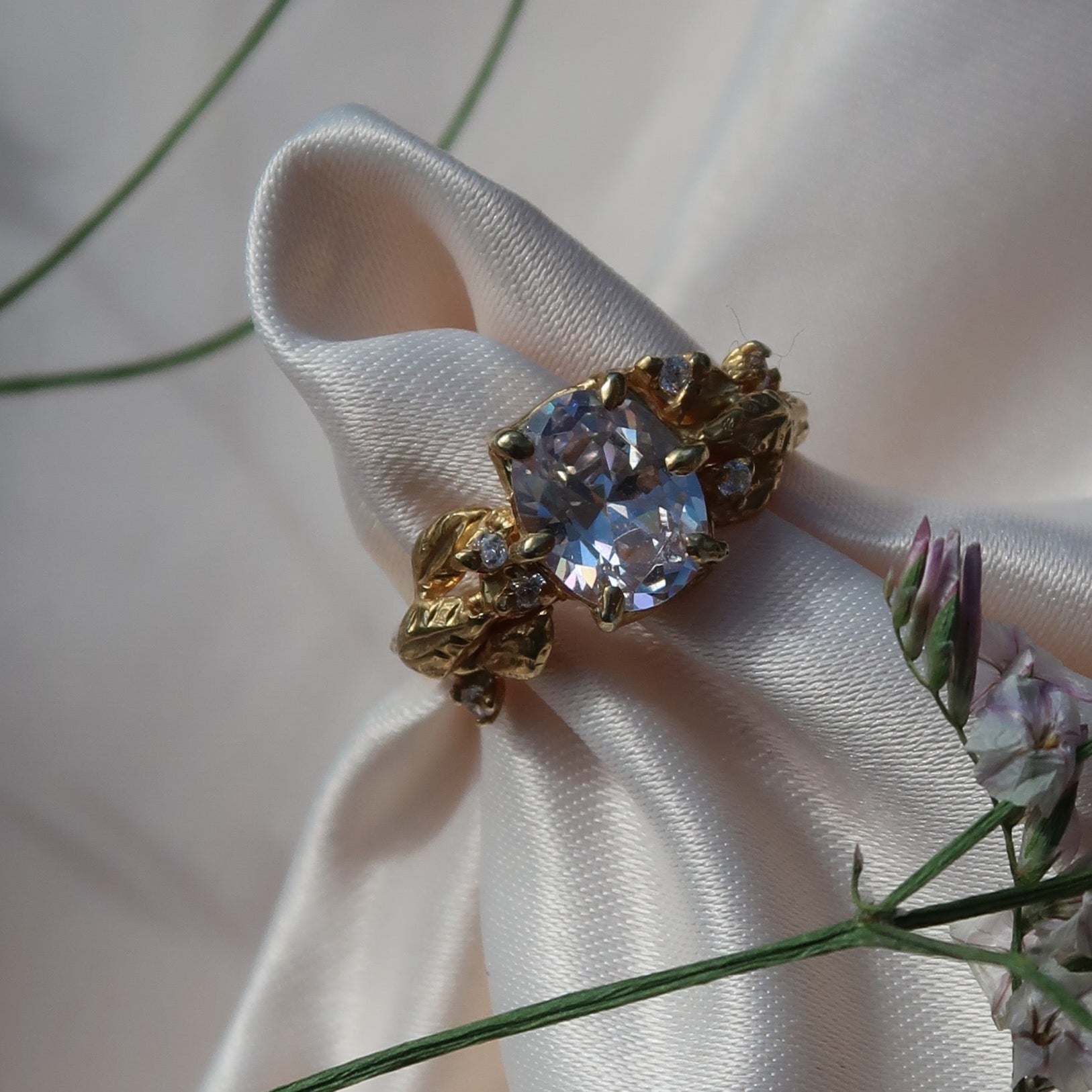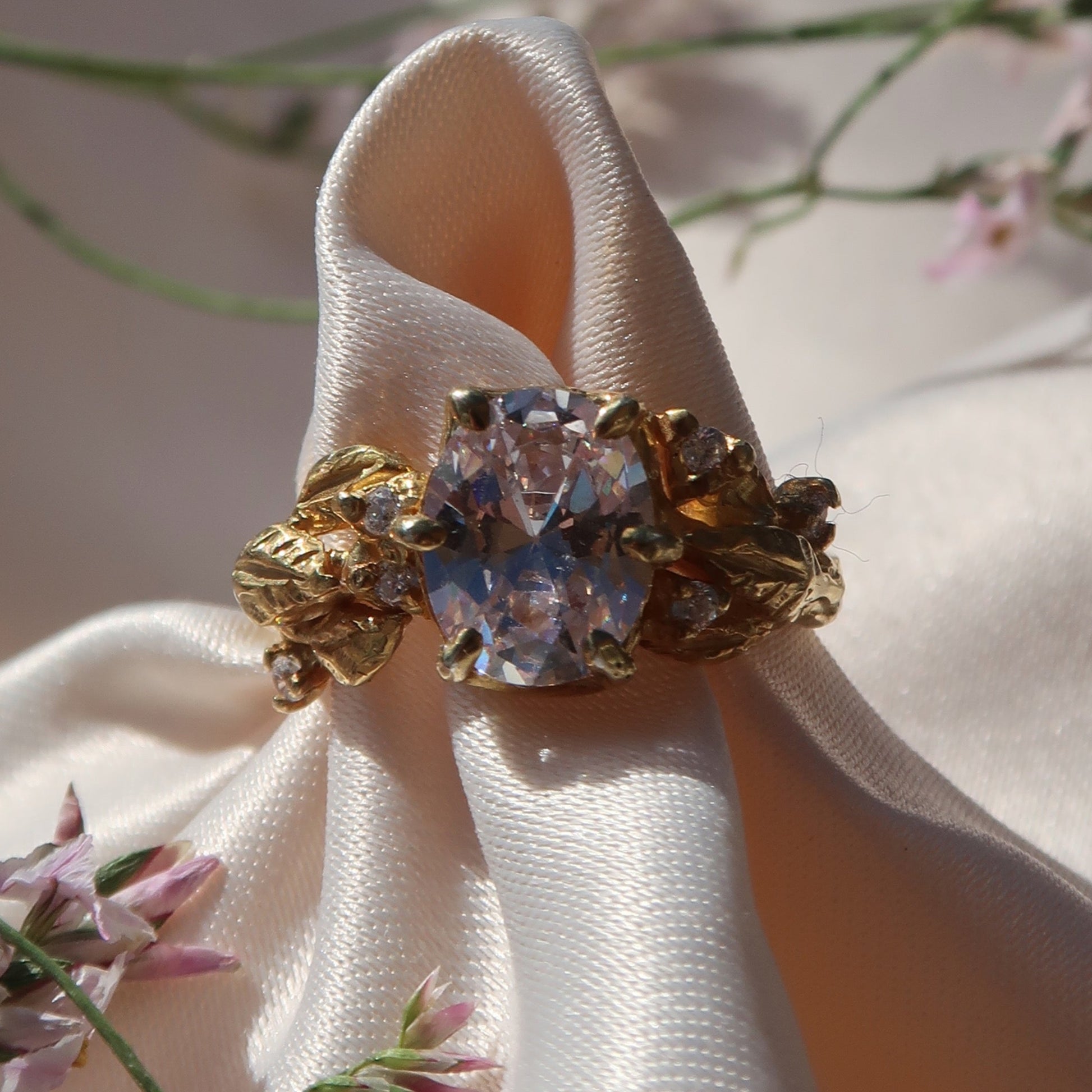 Embodying natural beauty, the Fernhollow Solitaire ring is a whimsical engagement ring with a 2ct oval-cut stone as its centrepiece. Adorned with leafy details and 3x 1.5mm highlight stones on either side of the band, it's a ring fit for a fairy tale proposal. Let this ethereal ring symbolise your eternal love in a unique and enchanting way.
