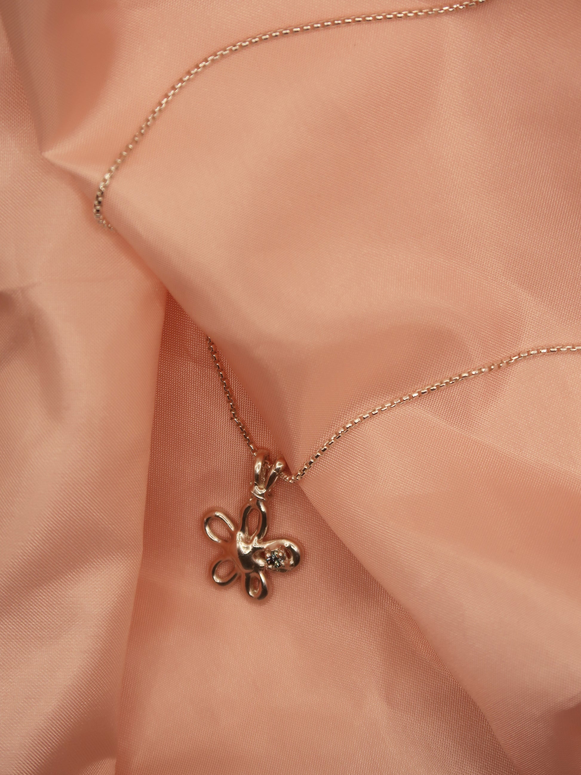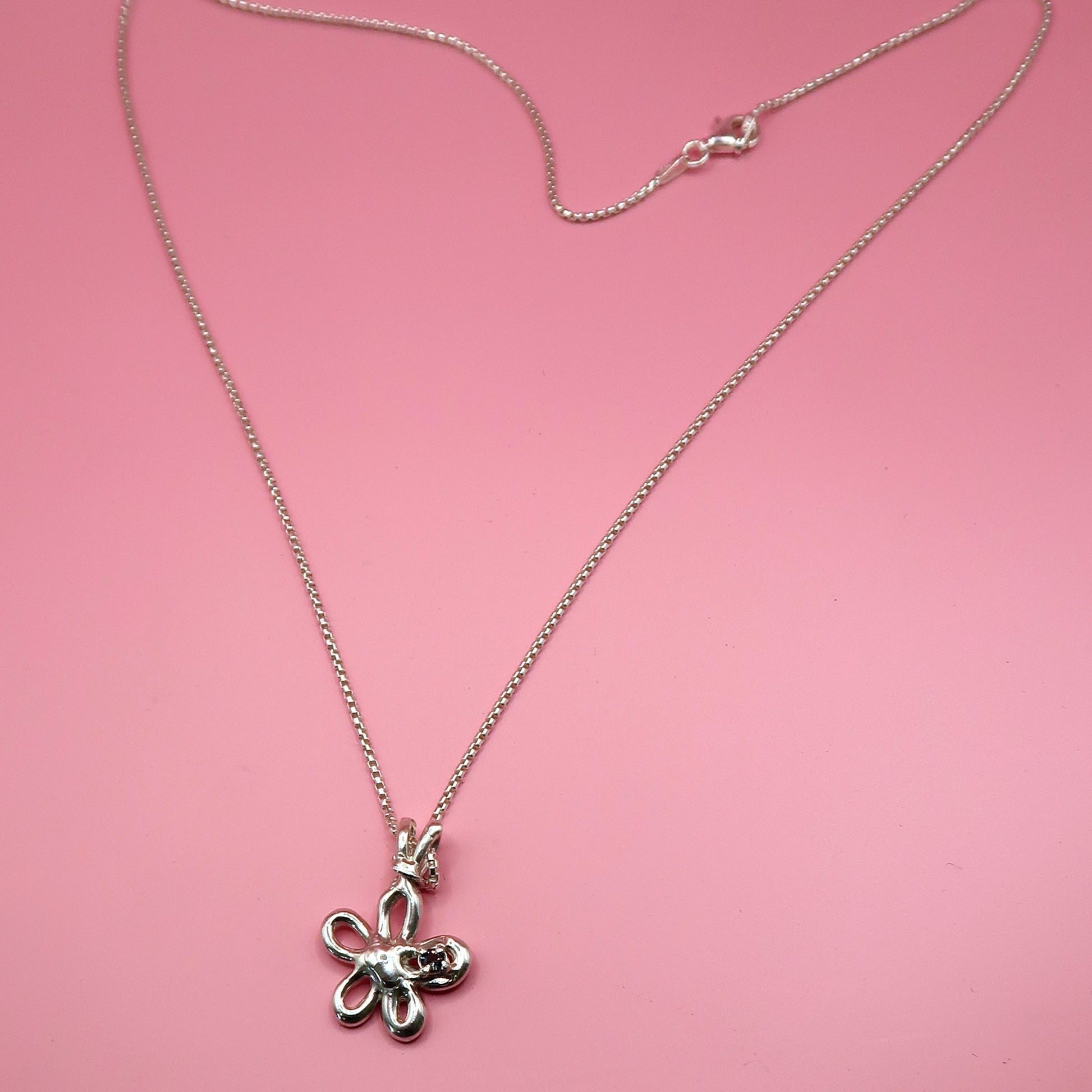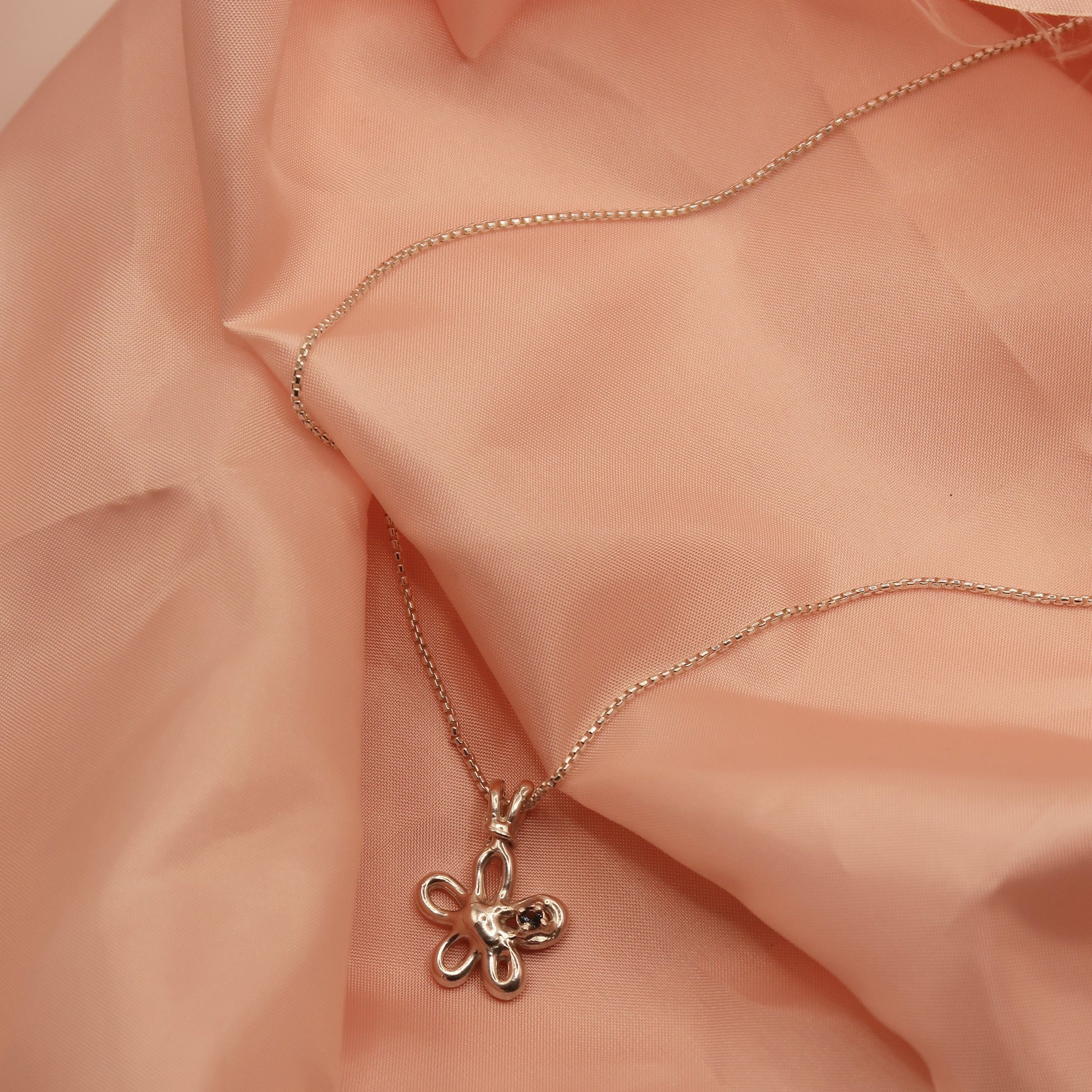 A one-of-one pendant necklace based on the previously retired Flirty Flower pendant style. This necklace is gorgeous and features a stunning natural 2.6mm Australian sapphire and recycled sterling silver. The pendant comes with a beautiful box chain and is 44cm in length.