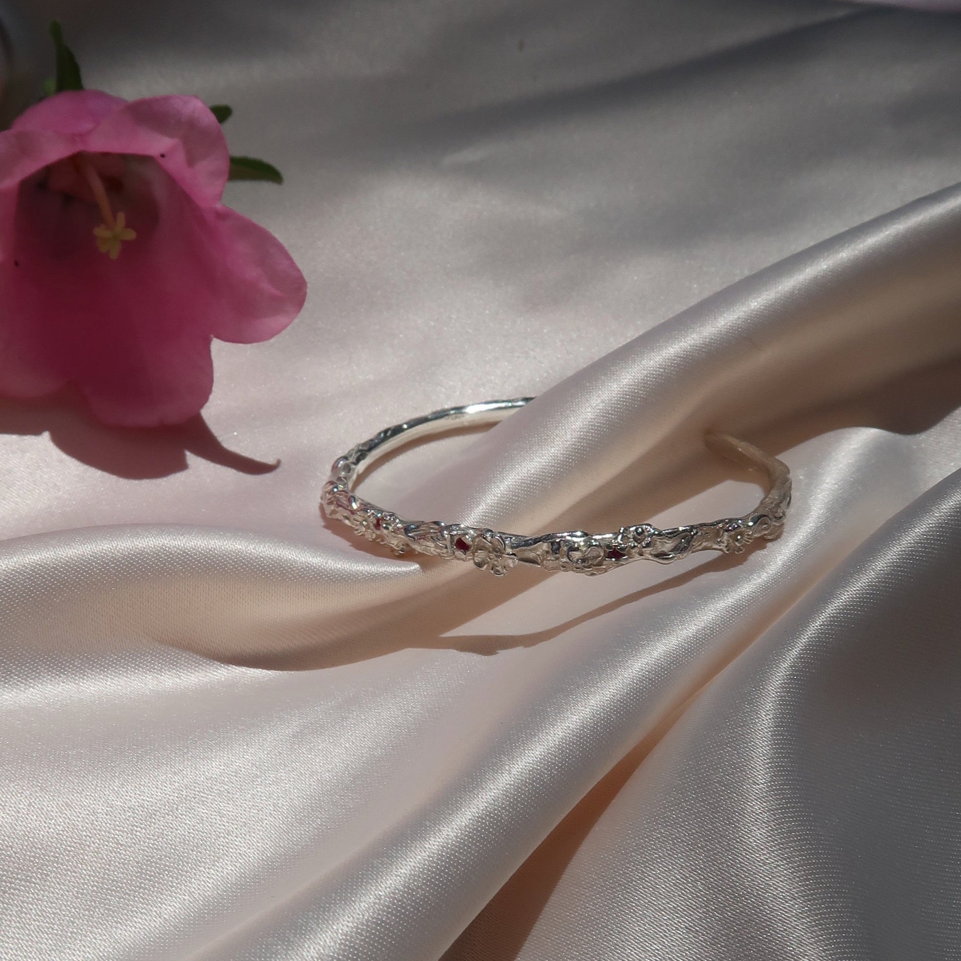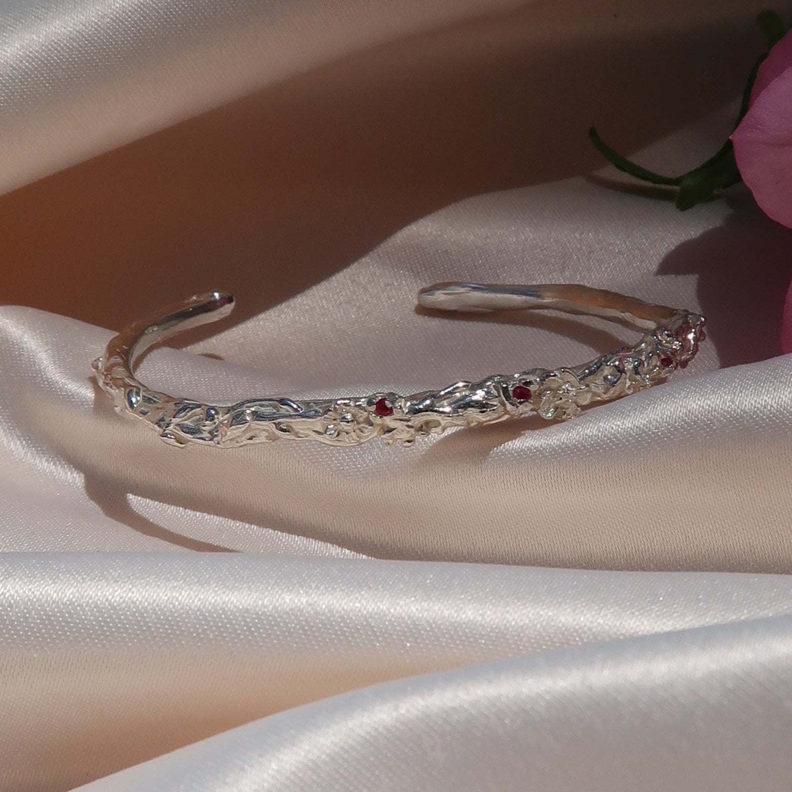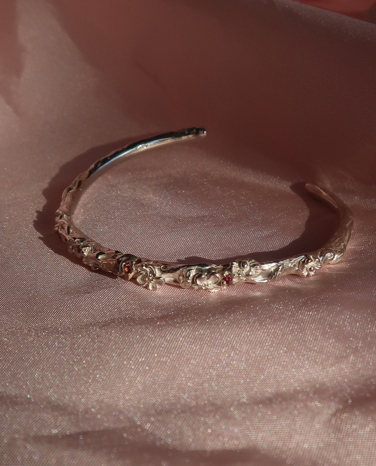A delicate yet stunning piece crafted with intricate floral and vine details that wrap around the cuff. Adorned with three small warm toned sapphires.