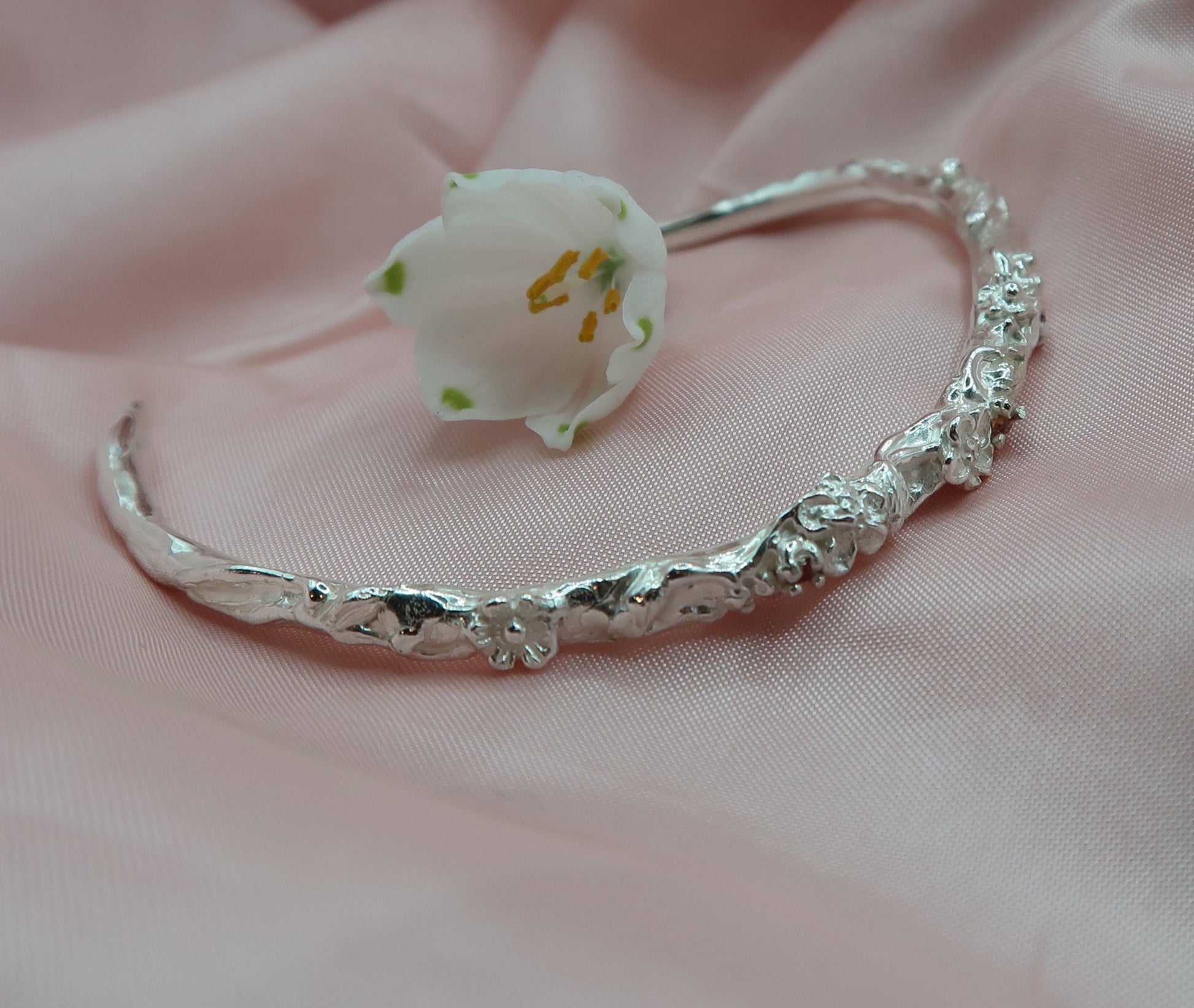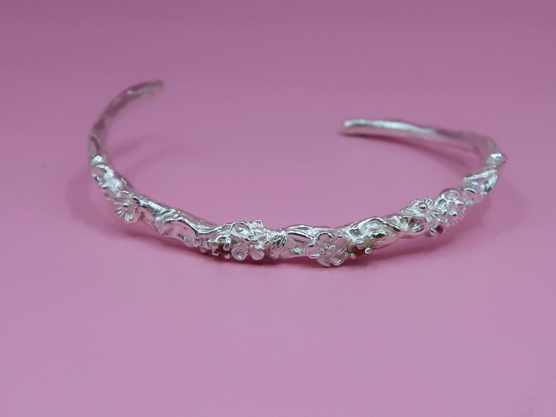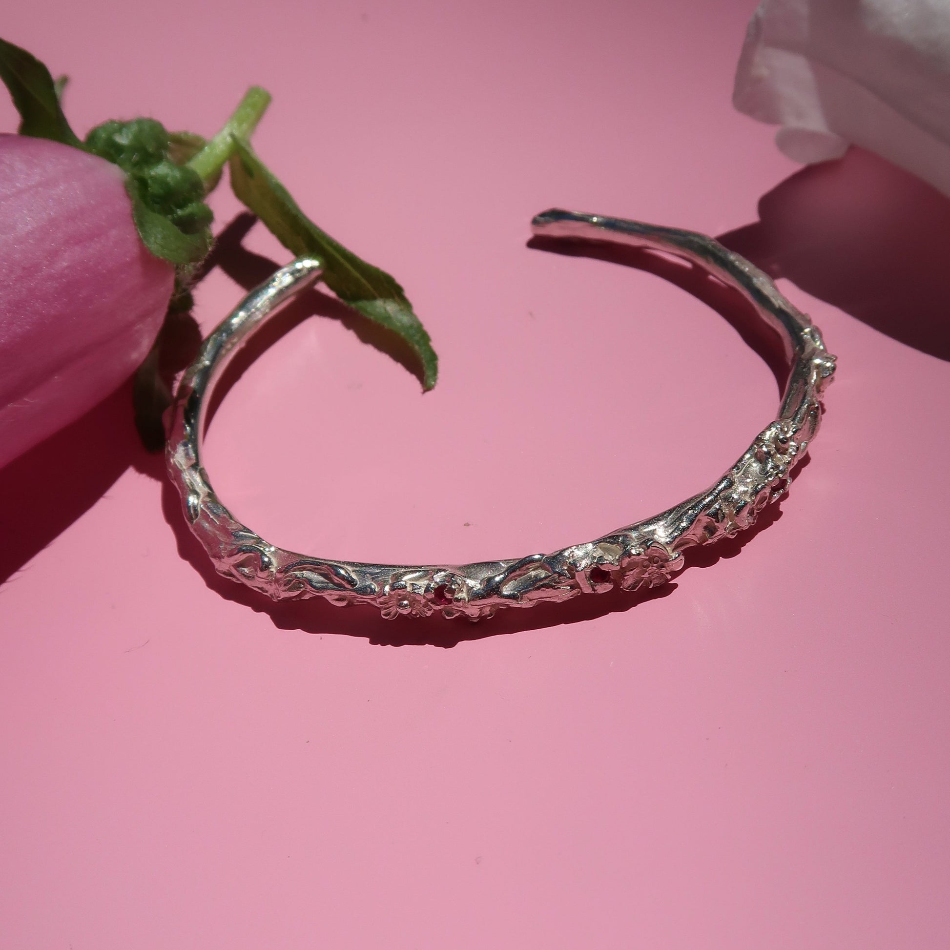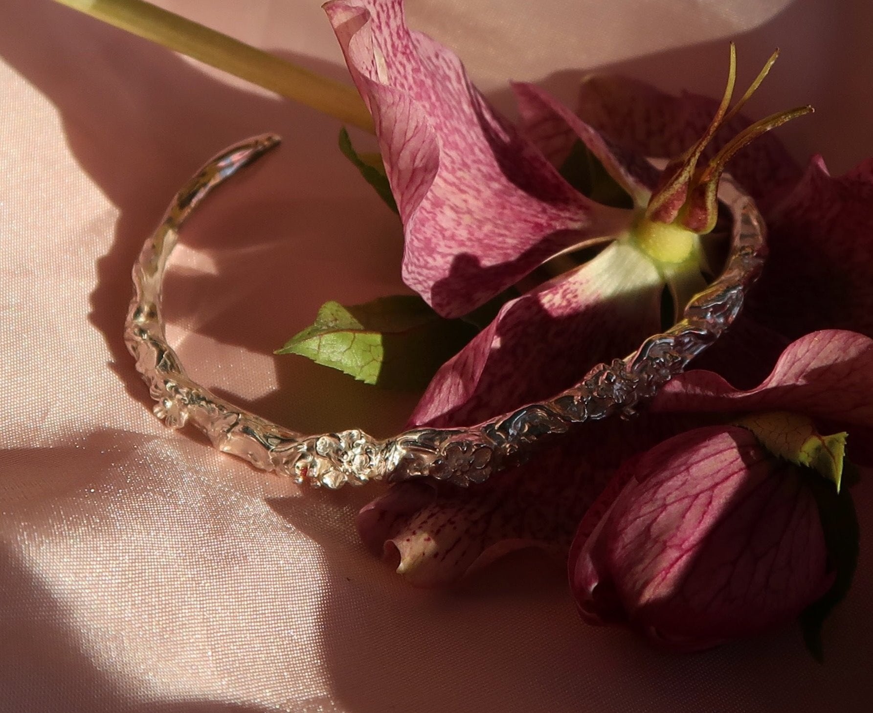 A delicate yet stunning piece crafted with intricate floral and vine details that wrap around the cuff. Adorned with three small warm toned sapphires.